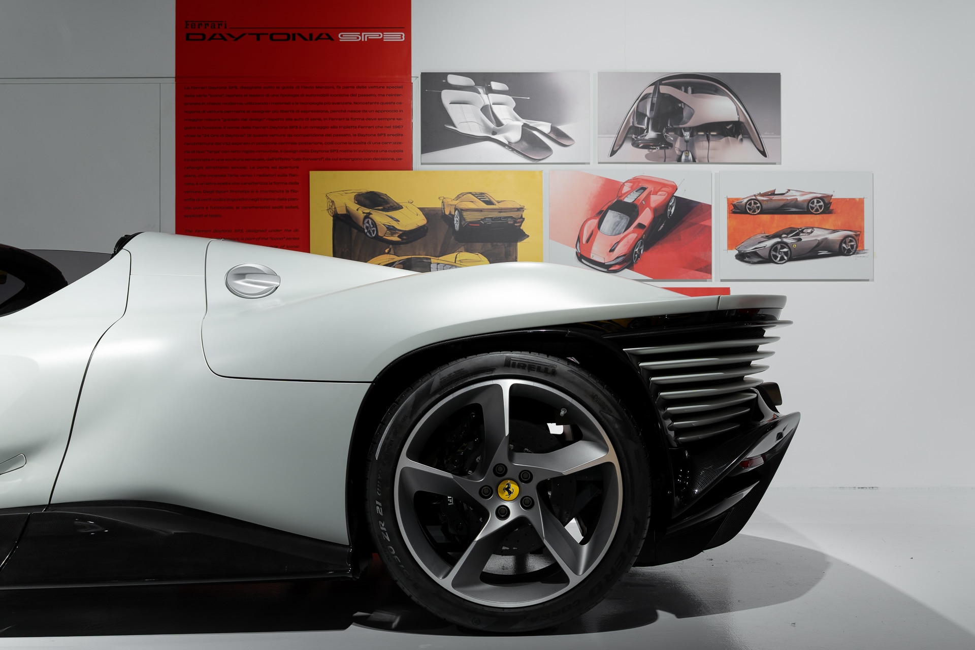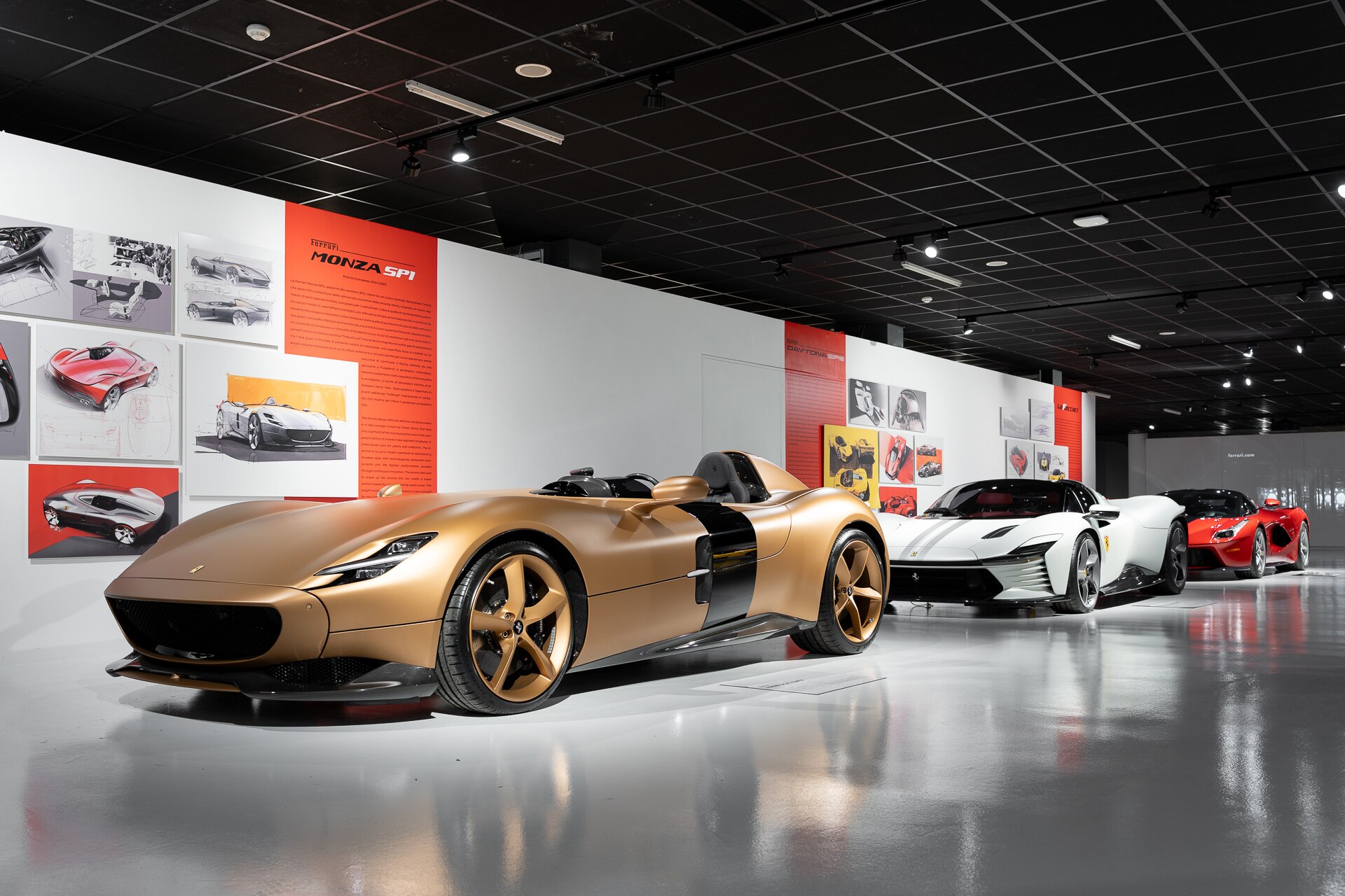 Sono undici le rosse esposte: la FXX-K del 2014, vincitrice del Compasso d’Oro 2016; la Daytona SP3 del 2021, ispirata alle automobili d’epoca; la Vision Gran Turismo del 2022, prima concept car di Maranello dedicata al mondo del motorsport virtuale; la F80 del 2024, l’apice della tecnologia applicata a una supercar; la 12Cilindri del 2024, connubio di tradizione e innovazione. Tra le vetture di produzione figurano la LaFerrari del 2013, prima Rossa stradale a alimentazione ibrida; la Monza SP1 del 2018, vincitrice del Compasso d’Oro 2020; la SF90 Stradale del 2019, prima ibrida plug-in di Maranello; la 296 GTB/GTS del 2021, rivoluzionaria vettura che monta un 6 cilindri; la Purosangue del 2022, vincitrice del Compasso d’Oro 2024. Infine, due esemplari unici: la SP38 del 2018 e la P80/C del 2019.