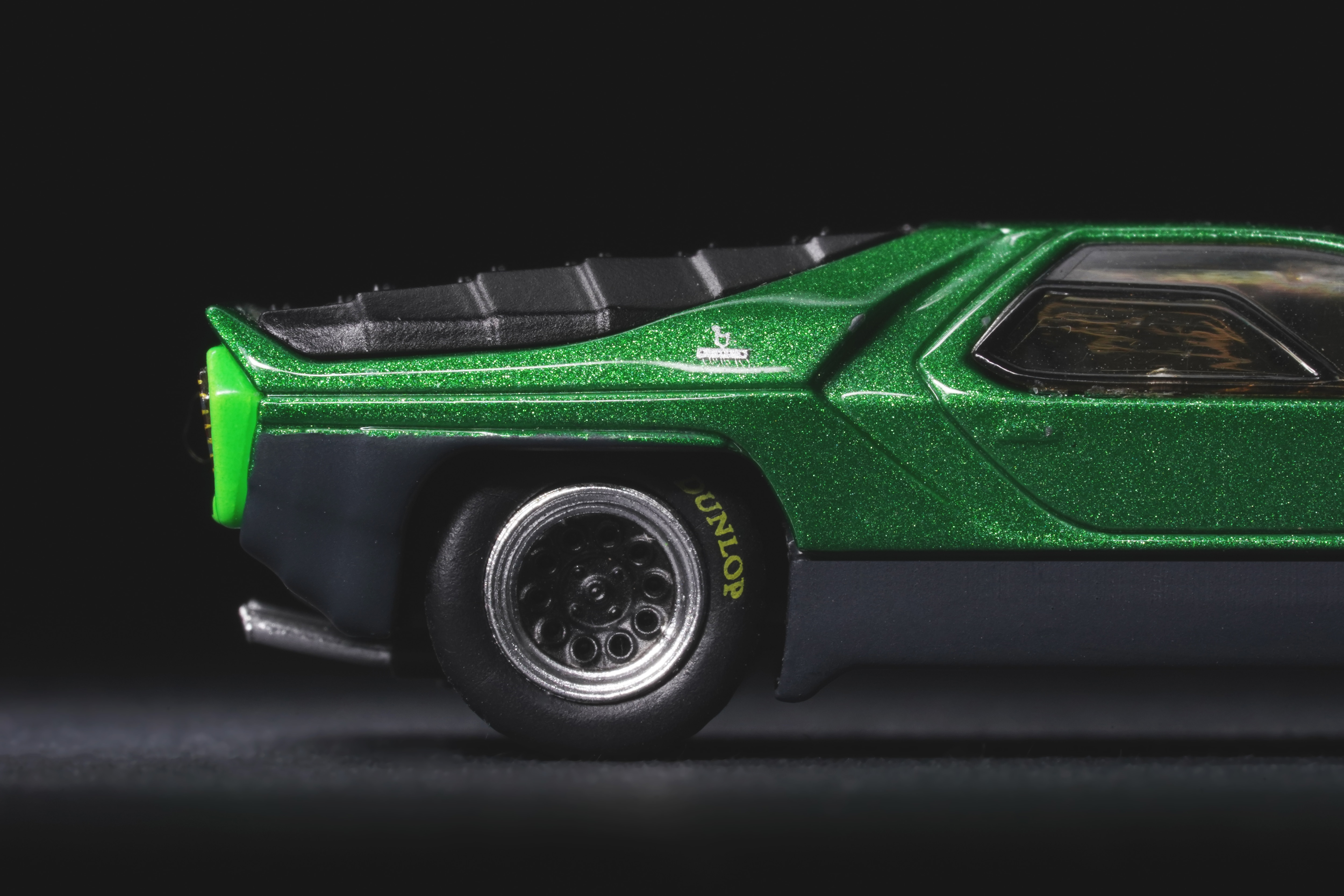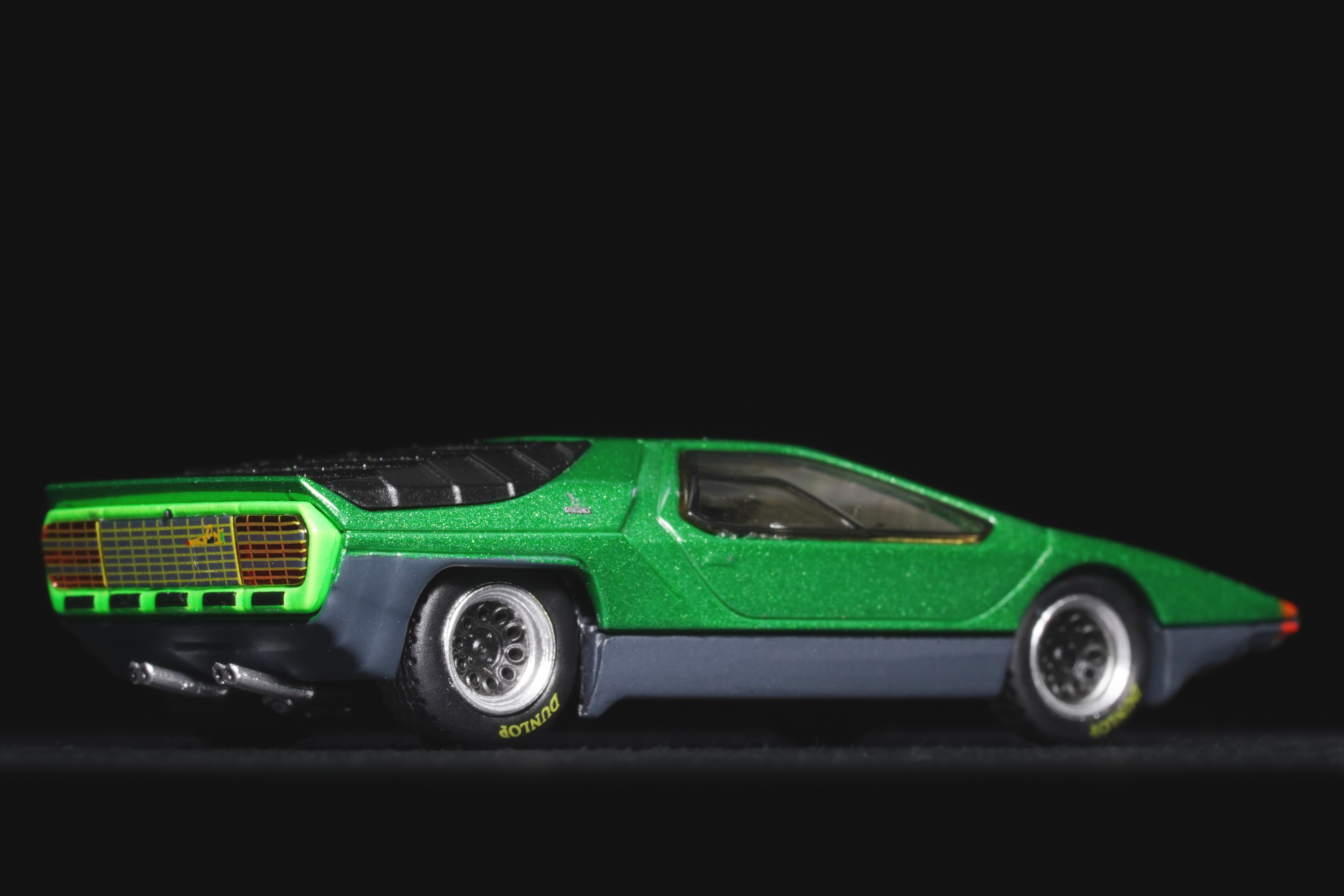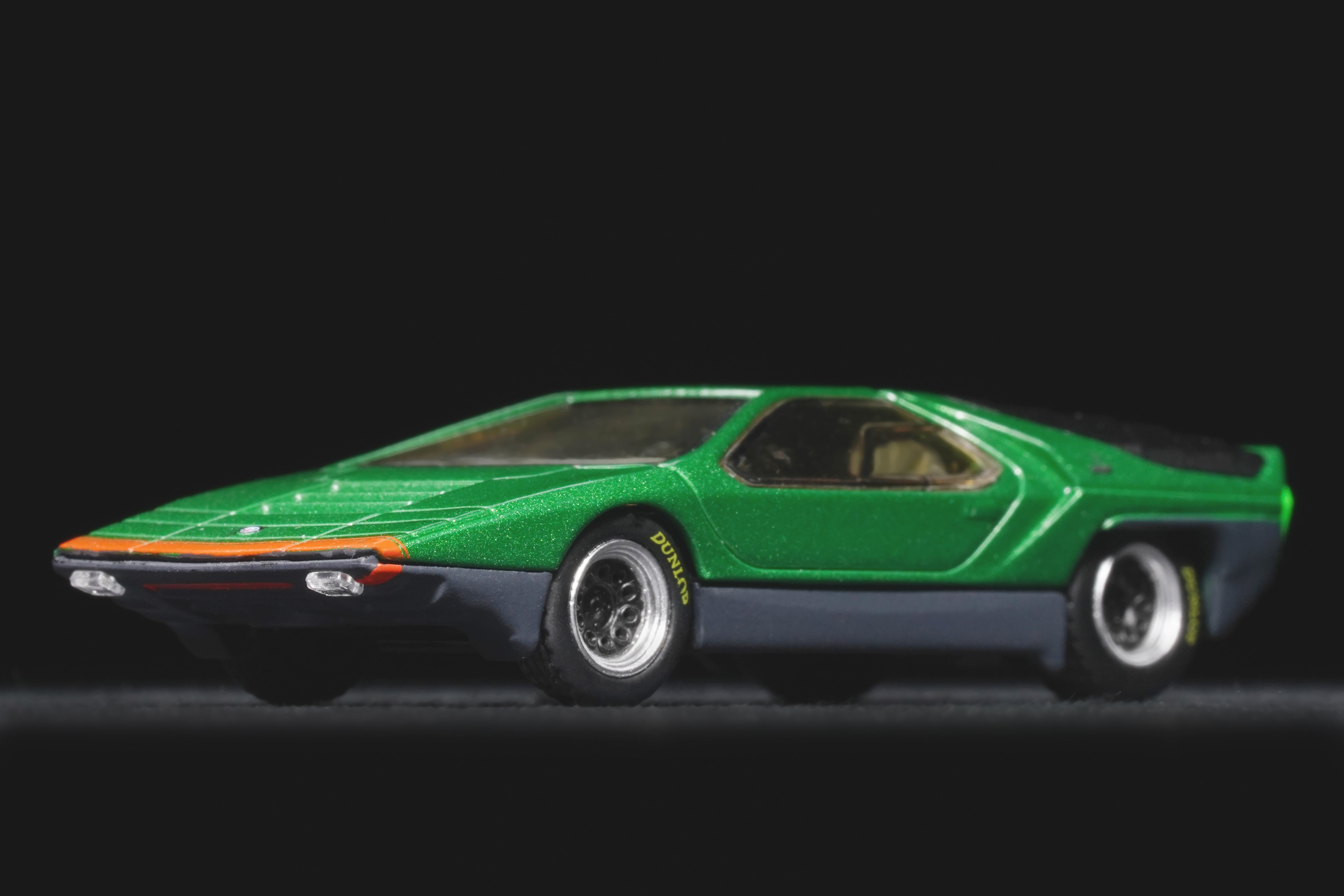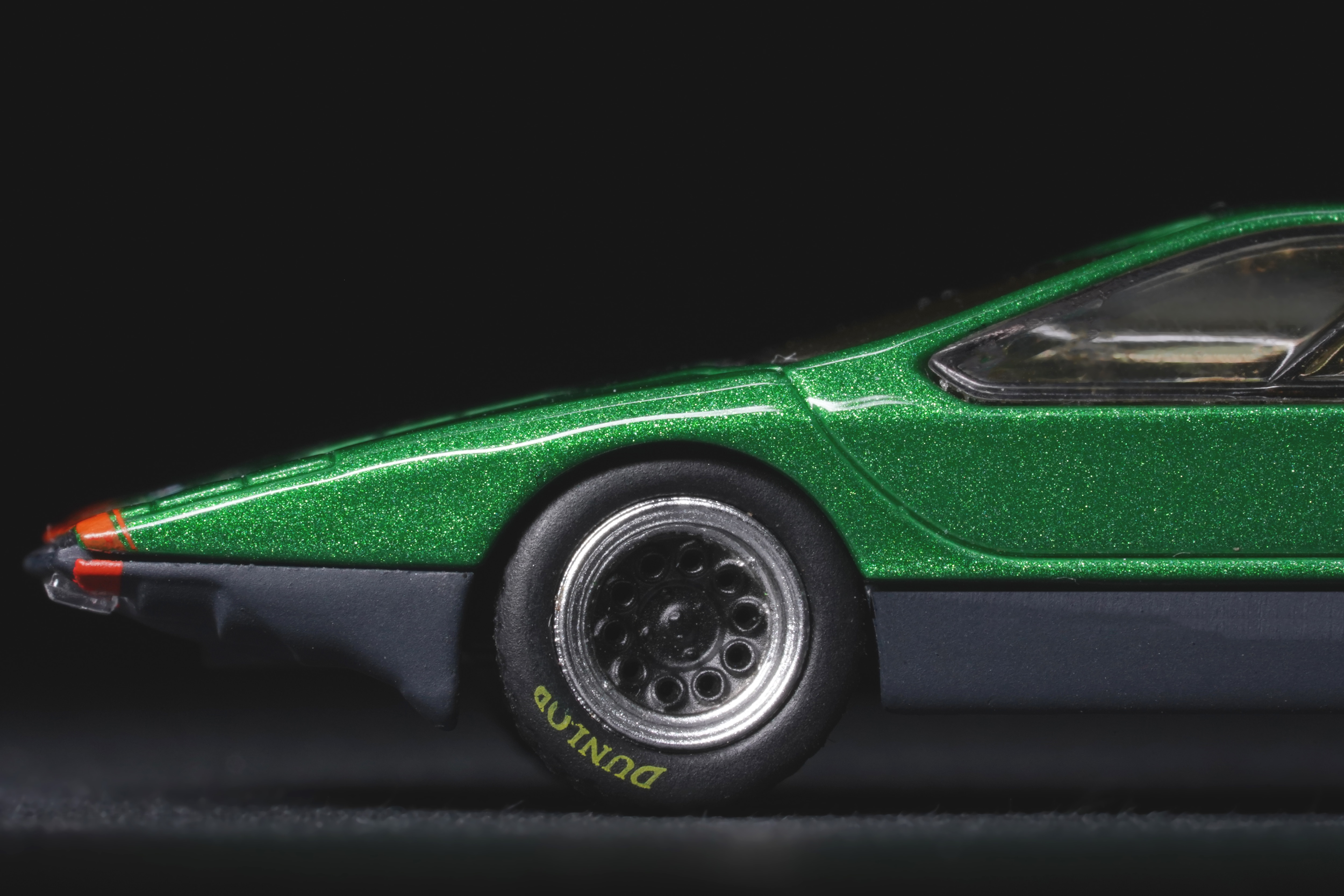Il modello riassume in pochi centimetri quest’opera di design, con un’attenzione che sorprende per una scala così ridotta, offrendo un pezzo da collezione che colpisce per precisione e, a 16,90 €, per prezzo. La carrozzeria bassissima, con il frontale sottile e affilato, è riprodotta con buona proporzione: i volumi sono ben legati, equilibrati e rispettano l’impostazione originale. Anche la particolare tinta verde metallizzata con inserti arancio (tratto distintivo della concept) è realizzata con una verniciatura uniforme e brillante, che restituisce bene il contrasto cromatico dell’auto vera. Interessante la resa delle superfici vetrate: nonostante la scala, la linea obliqua del parabrezza e il finestrino laterale mantengono la corretta inclinazione. Le ruote, pur inevitabilmente semplificate, hanno un disegno convincente tra cerchio e gomma, con tanto di logo Dunlop sulla spalla. La coda con le sottili feritoie è stata ricreata con più accuratezza di quanto ci si aspetterebbe nell’ “1:64”, preservando l’essenzialità delle forme.