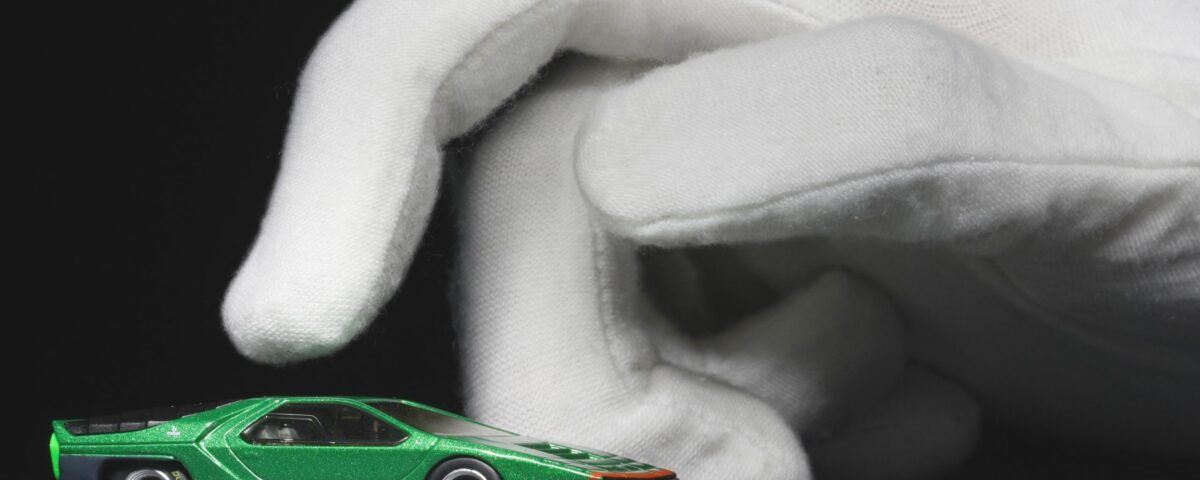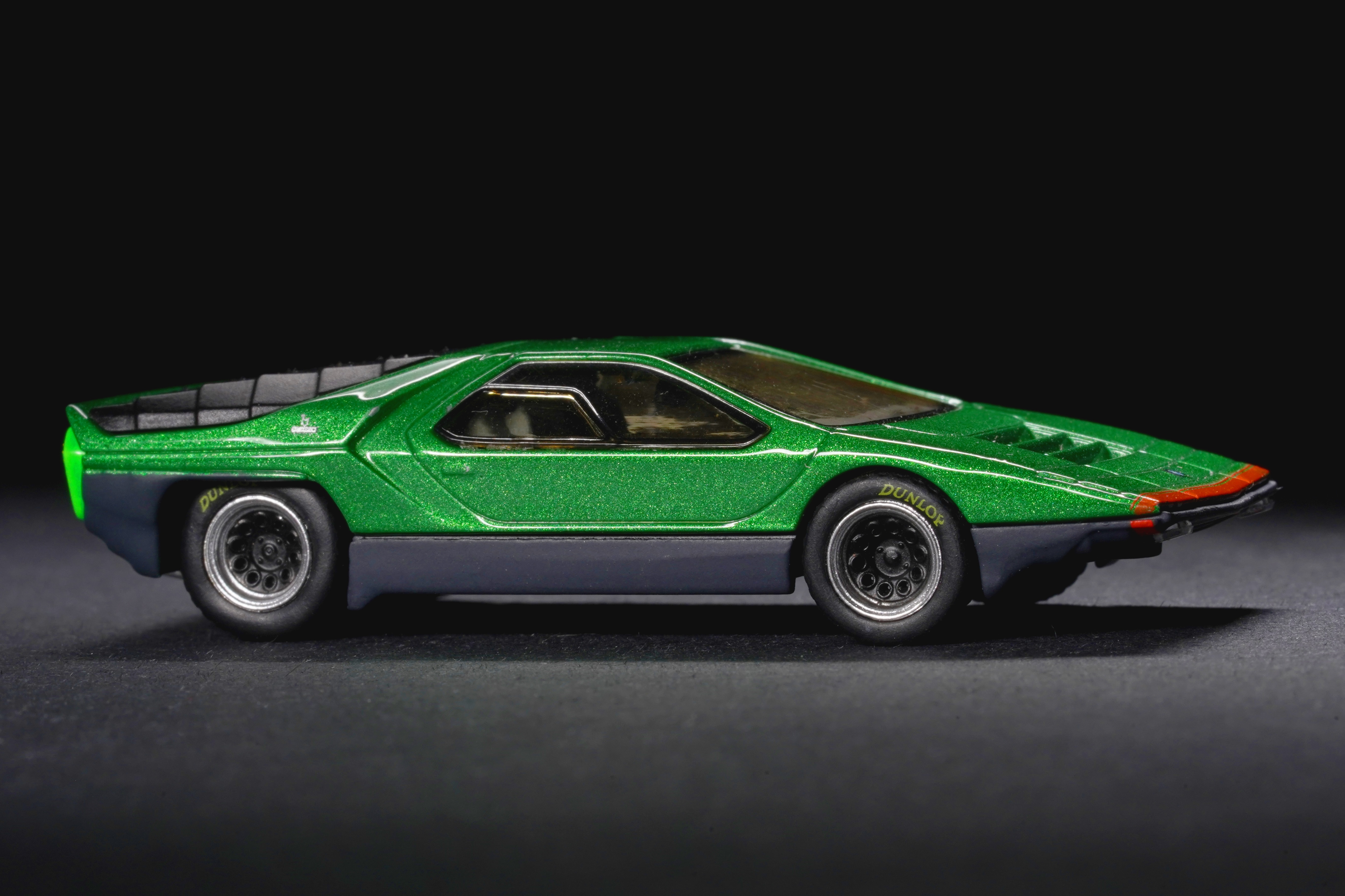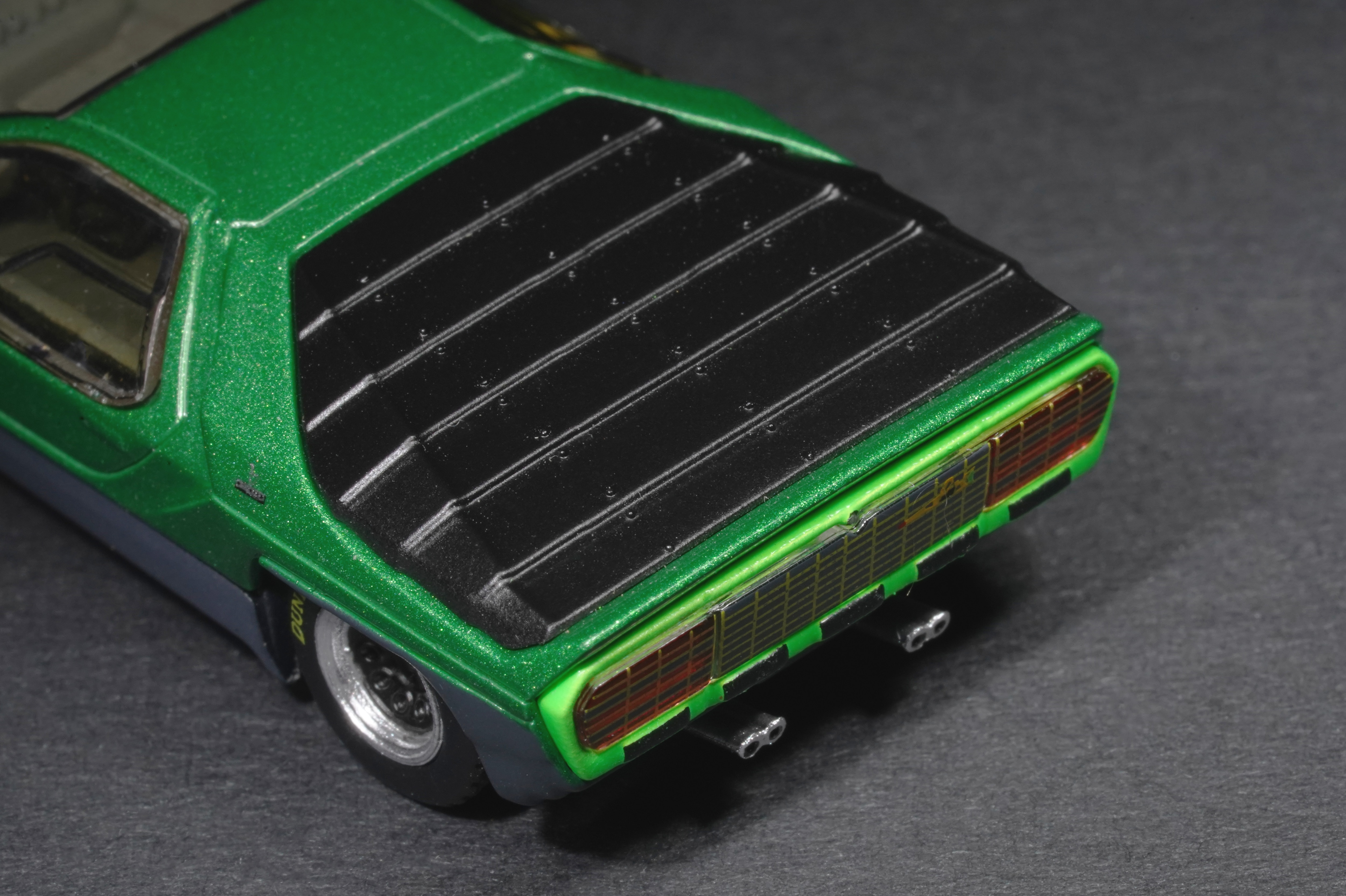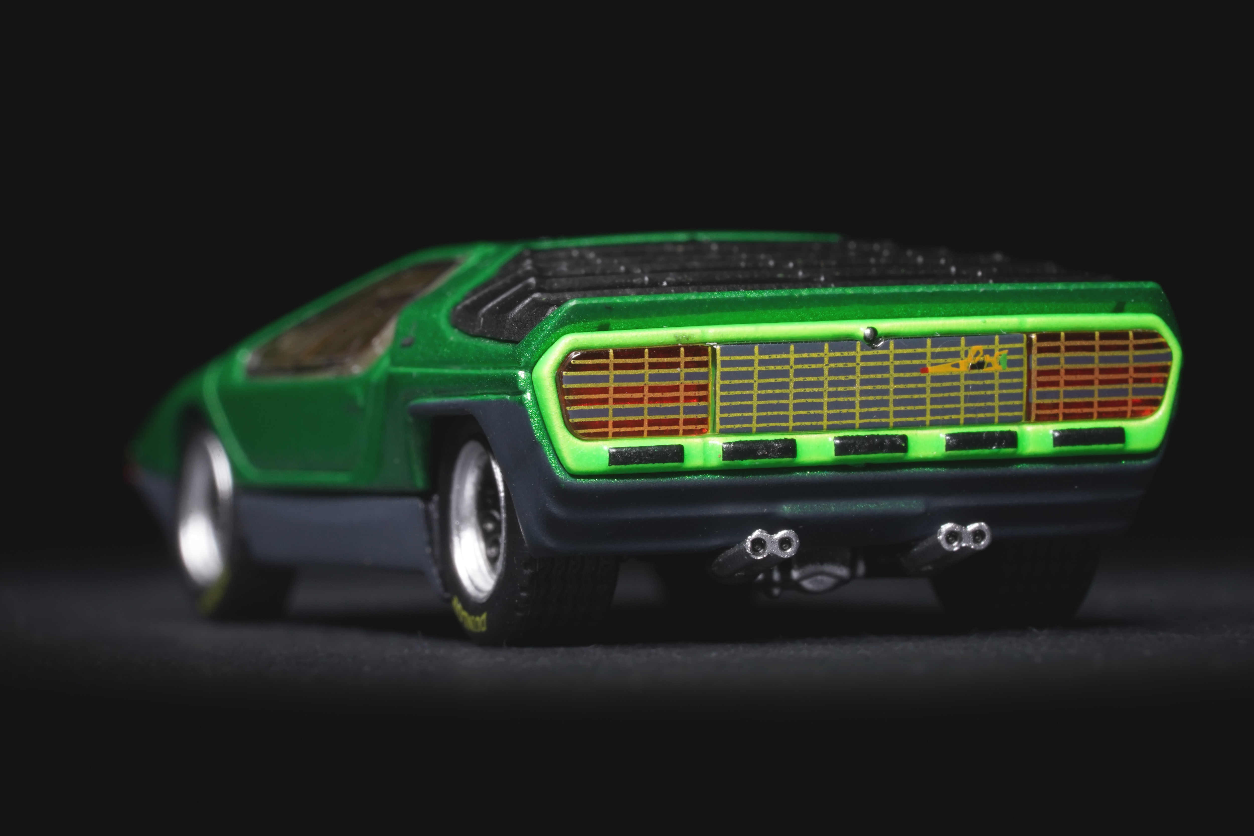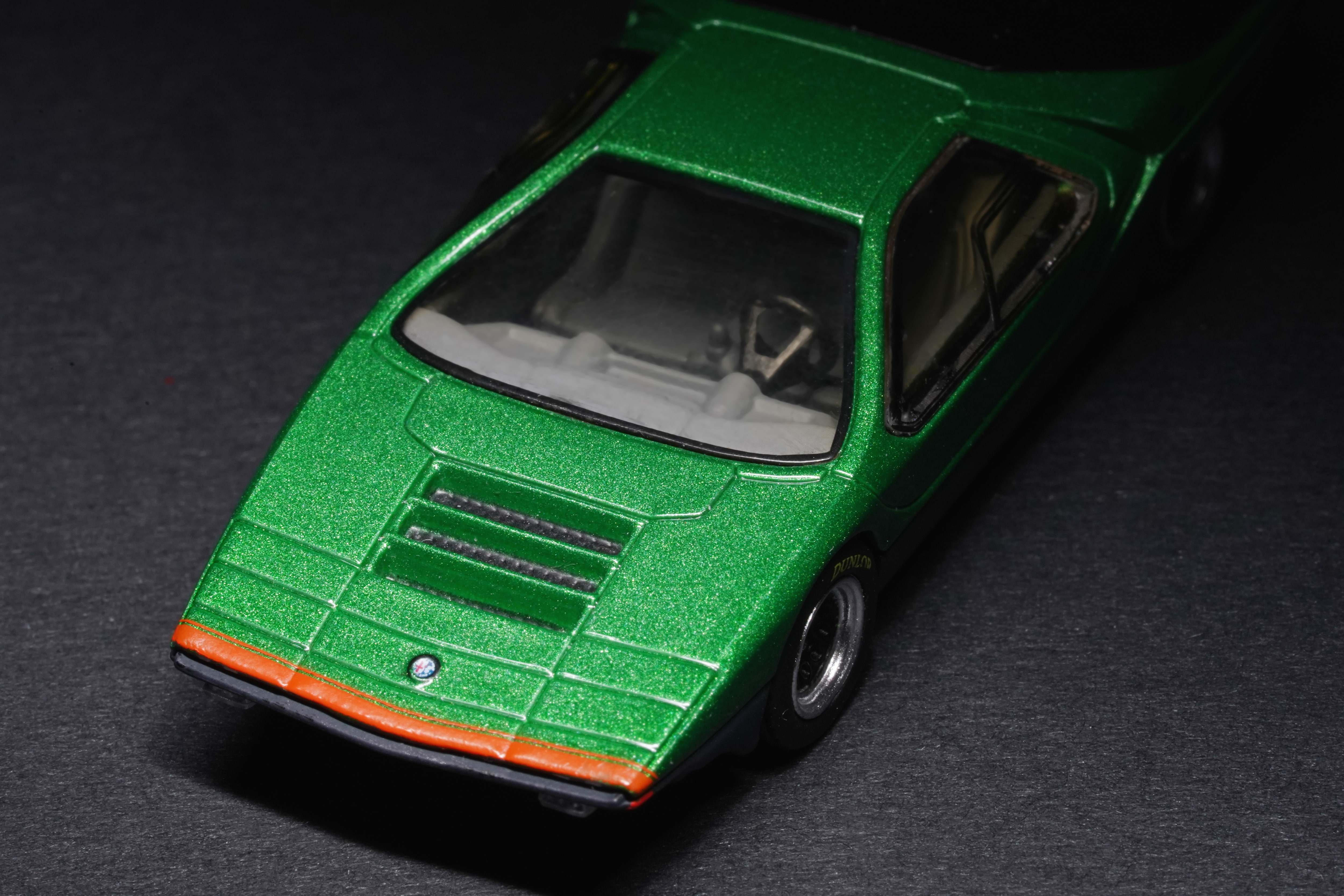 Il modello riassume in pochi centimetri quest’opera di design, con un’attenzione che sorprende per una scala così ridotta, offrendo un pezzo da collezione che colpisce per precisione e, a 16,90 €, per prezzo. La carrozzeria bassissima, con il frontale sottile e affilato, è riprodotta con buona proporzione: i volumi sono ben legati, equilibrati e rispettano l’impostazione originale. Anche la particolare tinta verde metallizzata con inserti arancio (tratto distintivo della concept) è realizzata con una verniciatura uniforme e brillante, che restituisce bene il contrasto cromatico dell’auto vera. Interessante la resa delle superfici vetrate: nonostante la scala, la linea obliqua del parabrezza e il finestrino laterale mantengono la corretta inclinazione. Le ruote, pur inevitabilmente semplificate, hanno un disegno convincente tra cerchio e gomma, con tanto di logo Dunlop sulla spalla. La coda con le sottili feritoie è stata ricreata con più accuratezza di quanto ci si aspetterebbe nell’ “1:64”, preservando l’essenzialità delle forme.