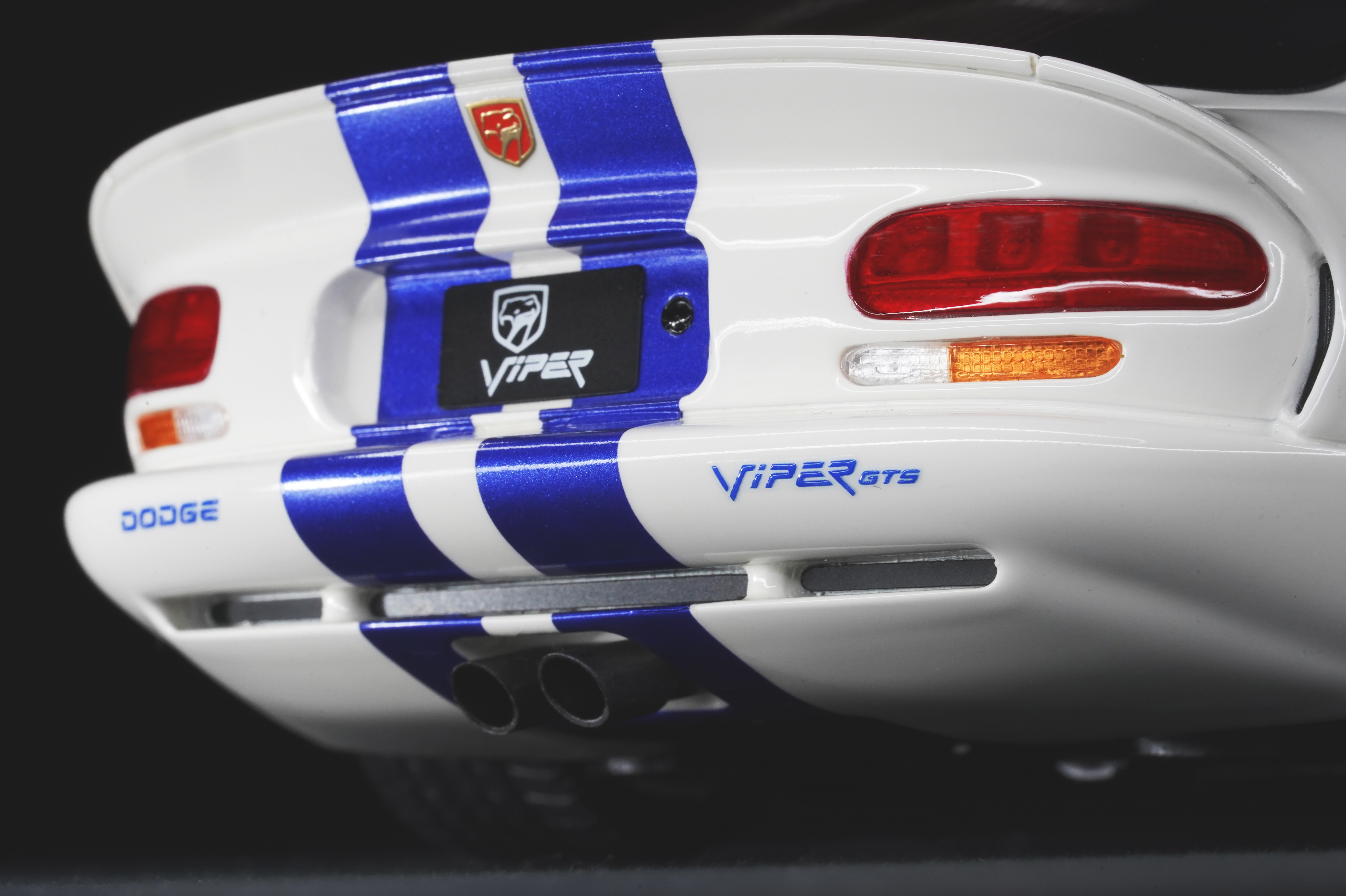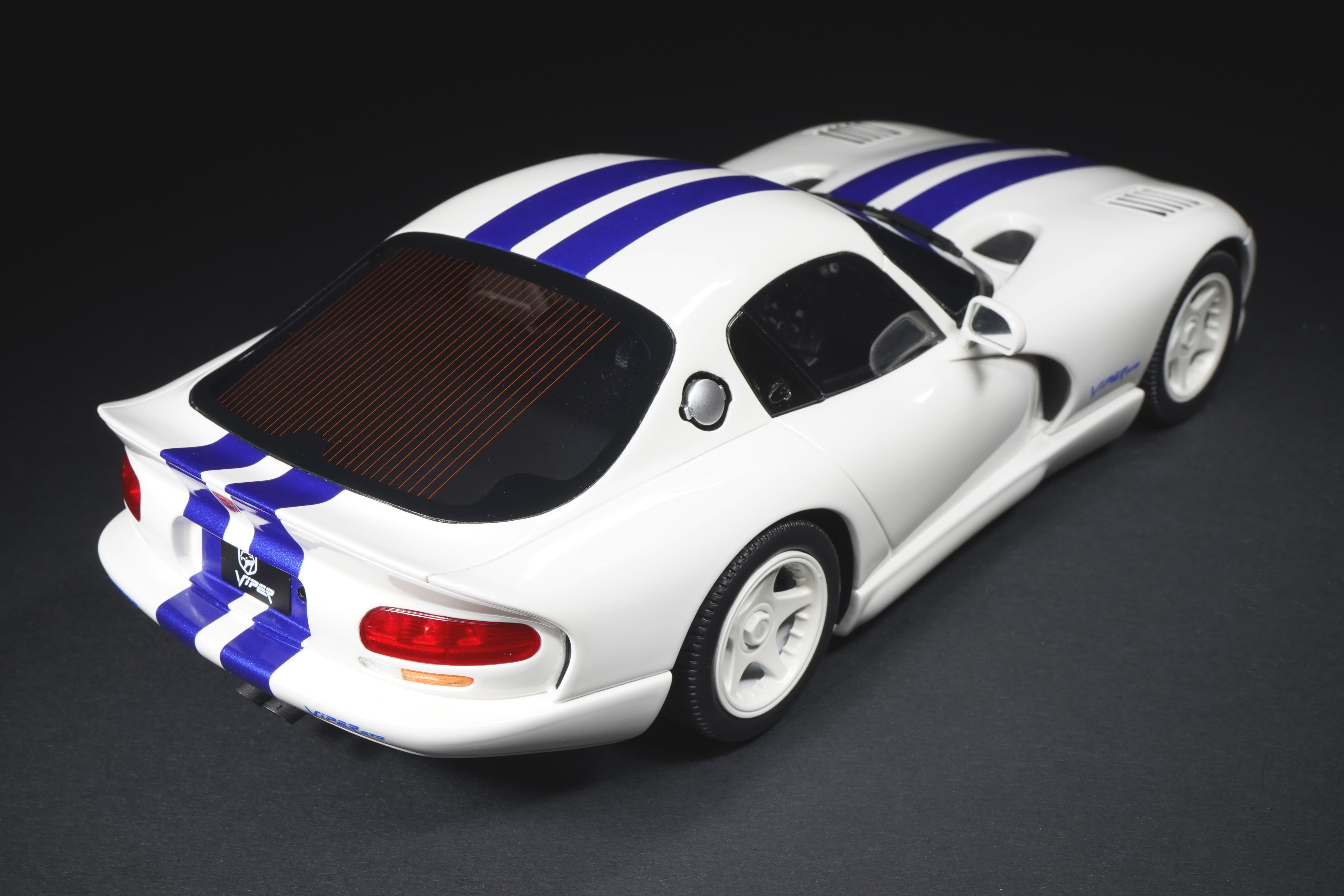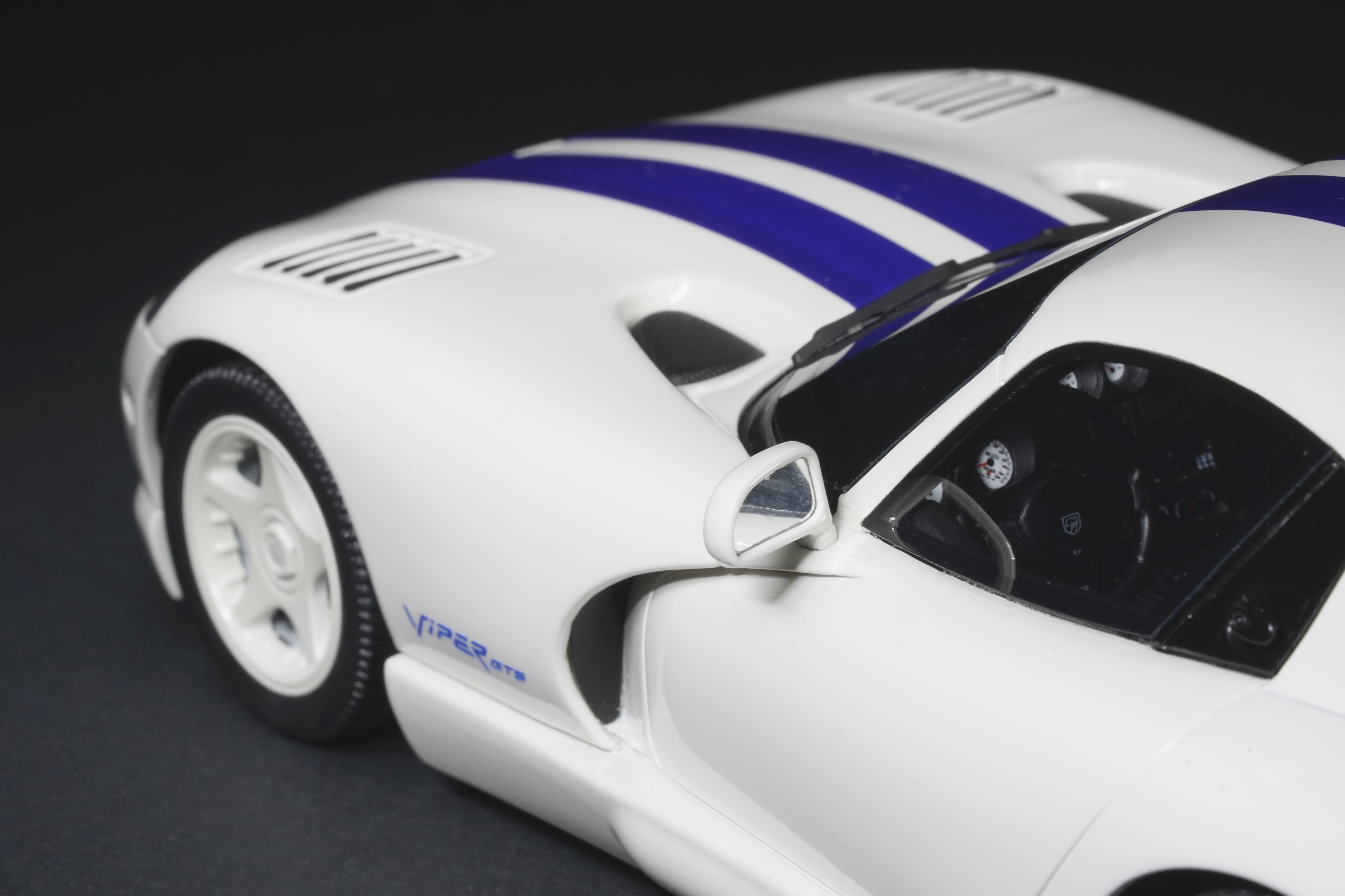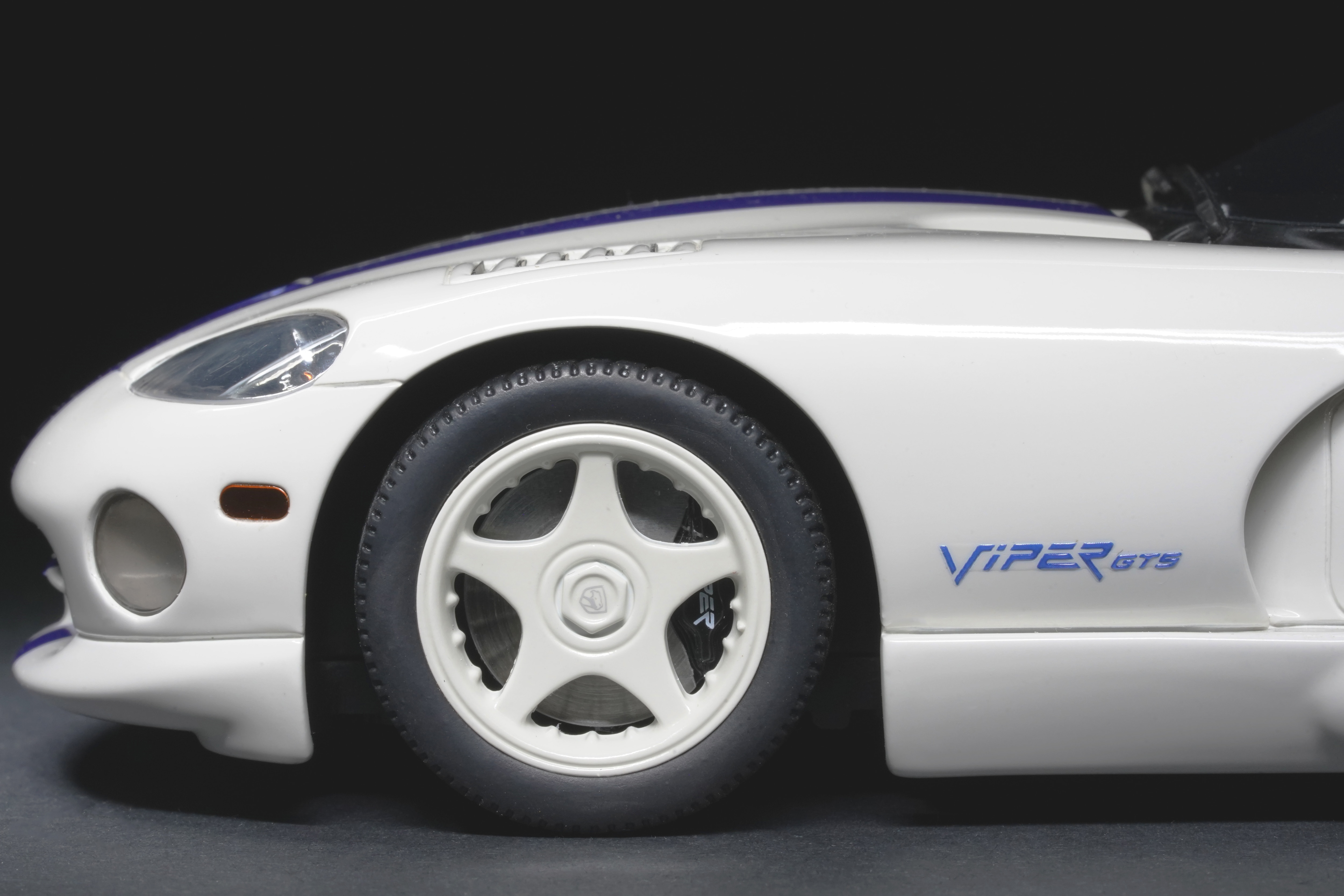 Il colpo d’occhio è dominato dal lungo cofano che custodisce il mostruoso V10 8 litri. Le prese d’aria e la particolare bombatura sono riprodotte con buona resa, mentre le righe blu, nette e precise, scorrono senza interruzioni dal muso alla coda, come sulla vettura reale, conferendole quel sapore “racing” che fece subito scuola nei vari abbinamenti cromatici. La verniciatura è lucida, senza imperfezioni e valorizza i molti dettagli apprezzabili della GTS: il paraurti anteriore con le grandi prese d’aria e tutta la fanaleria frontale carenata. Particolari i cerchi a cinque razze in tinta con la carrozzeria, con pneumatici in gomma di taglia XL con scolpitura vicina a quella originale, e assetto regolato alla giusta altezza. Le fiancate del modello mettono bene in risalto il profilo muscoloso, e le giuste geometrie scendono in picchiata verso la coda tronca. La vista posteriore chiude l’analisi esterna con la dominante fanaleria rossa orizzontale e la particolare forma dello spoiler, che la distingue dalle prime RT/10. Curato il doppio terminale posizionato centralmente, e tutti i loghi presenti sono graficamente precisi e di alta qualità.