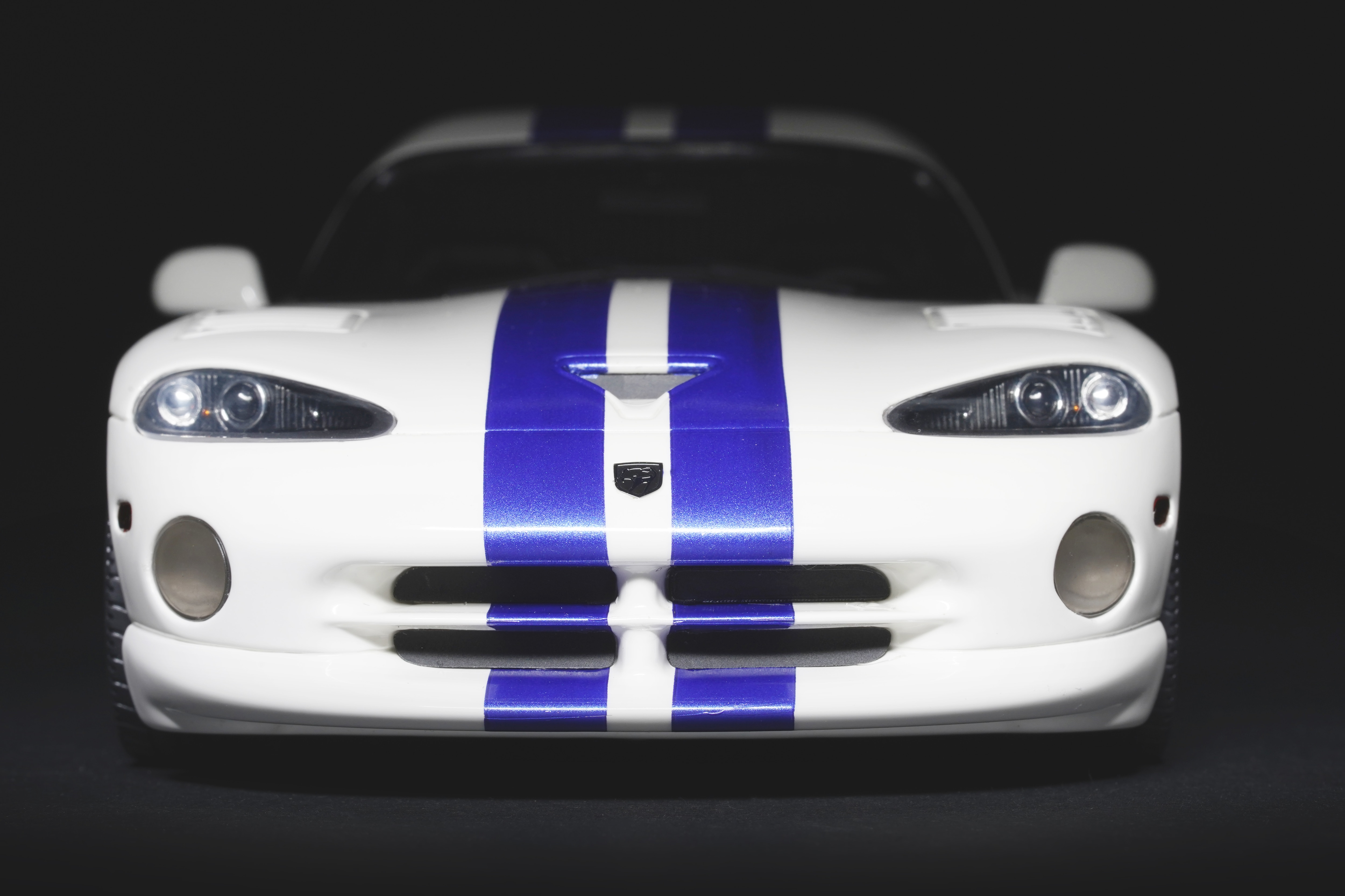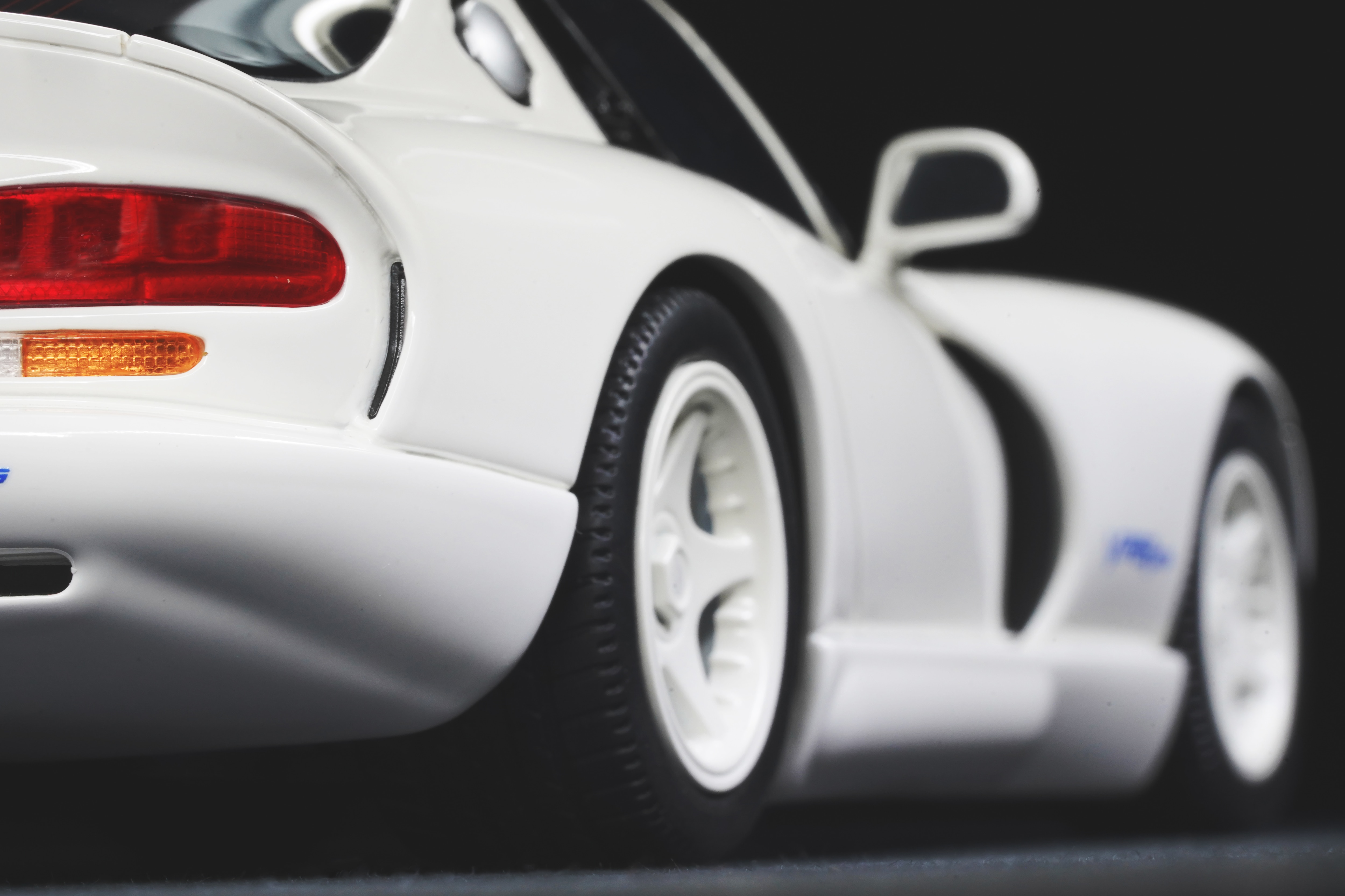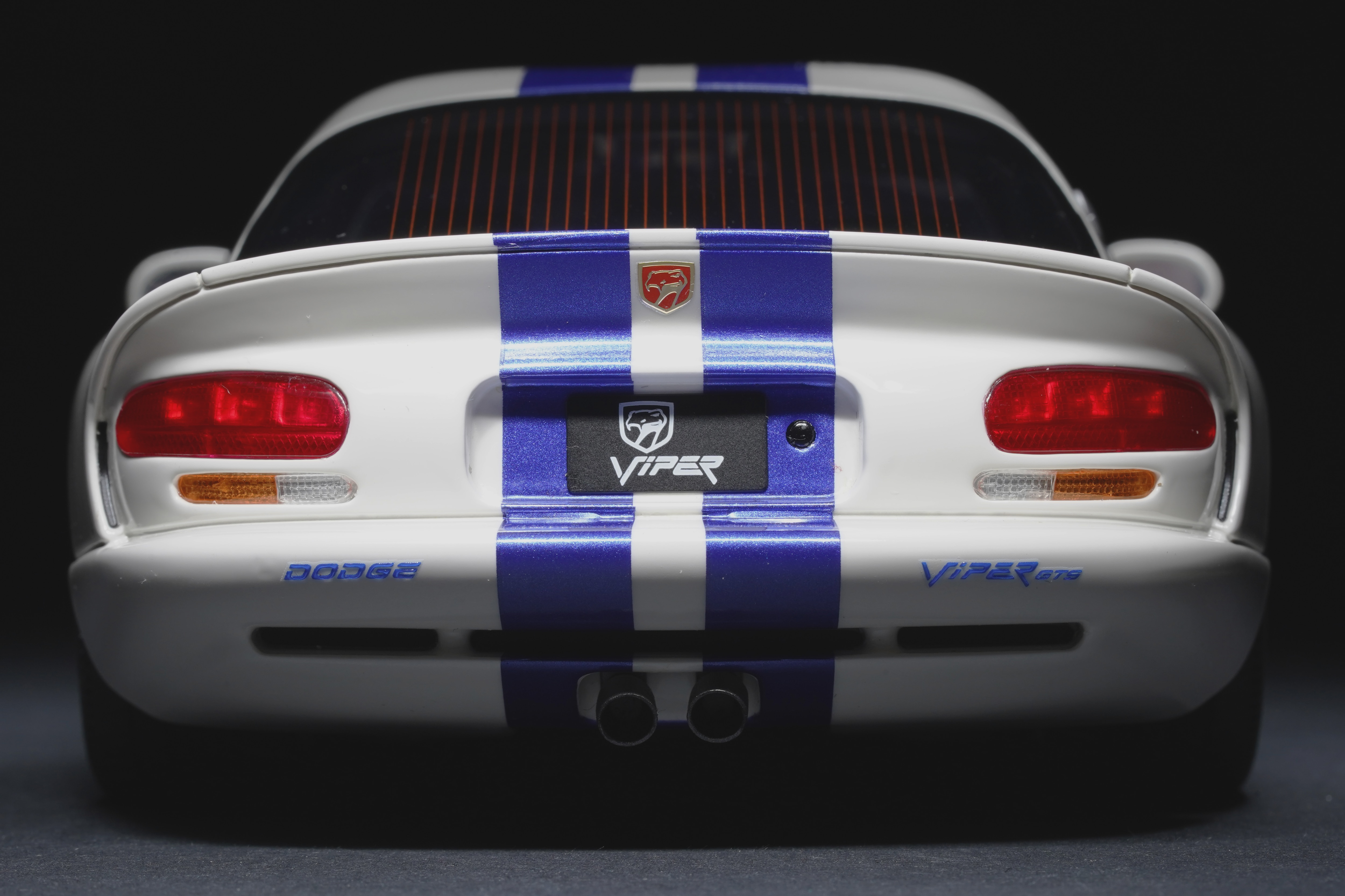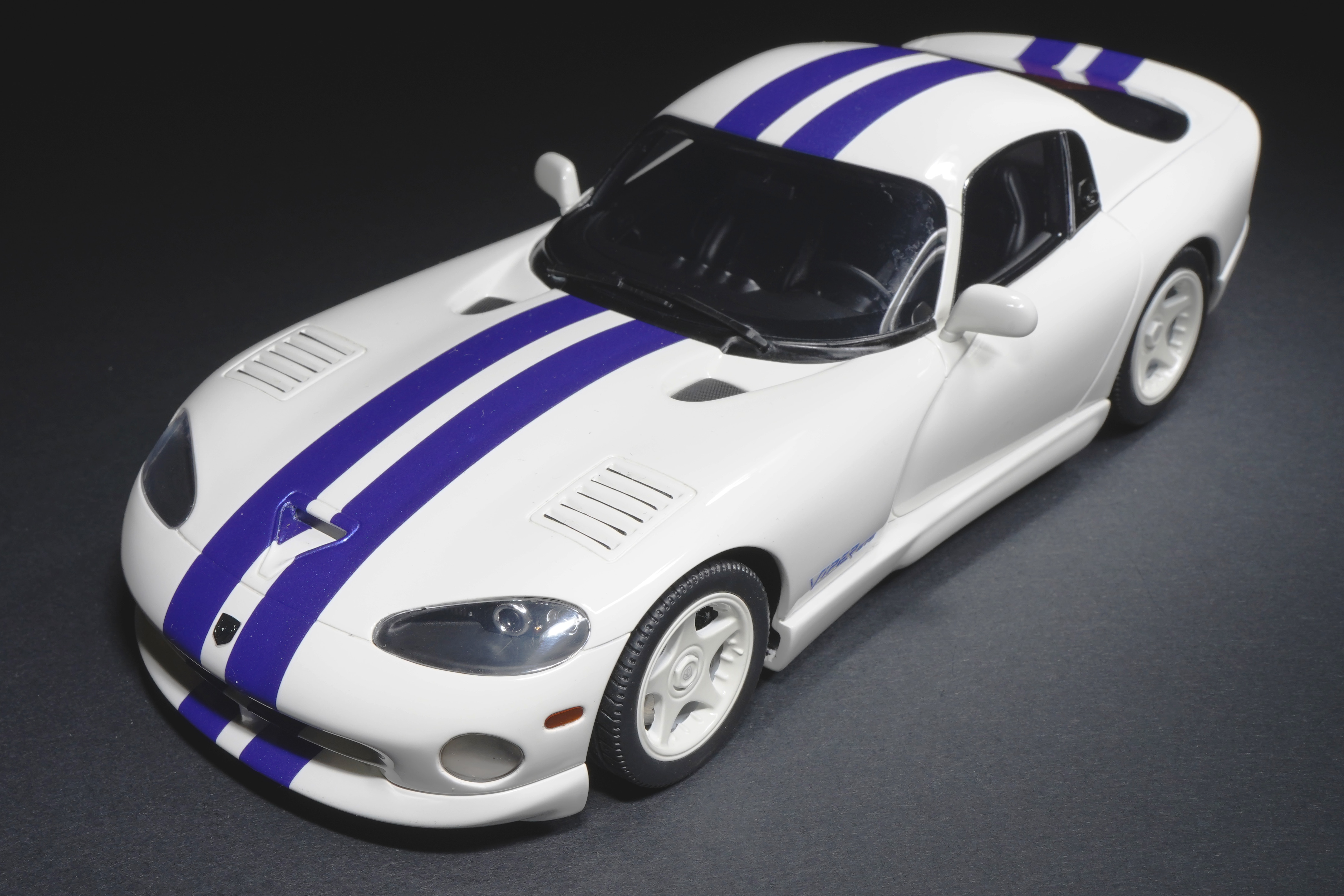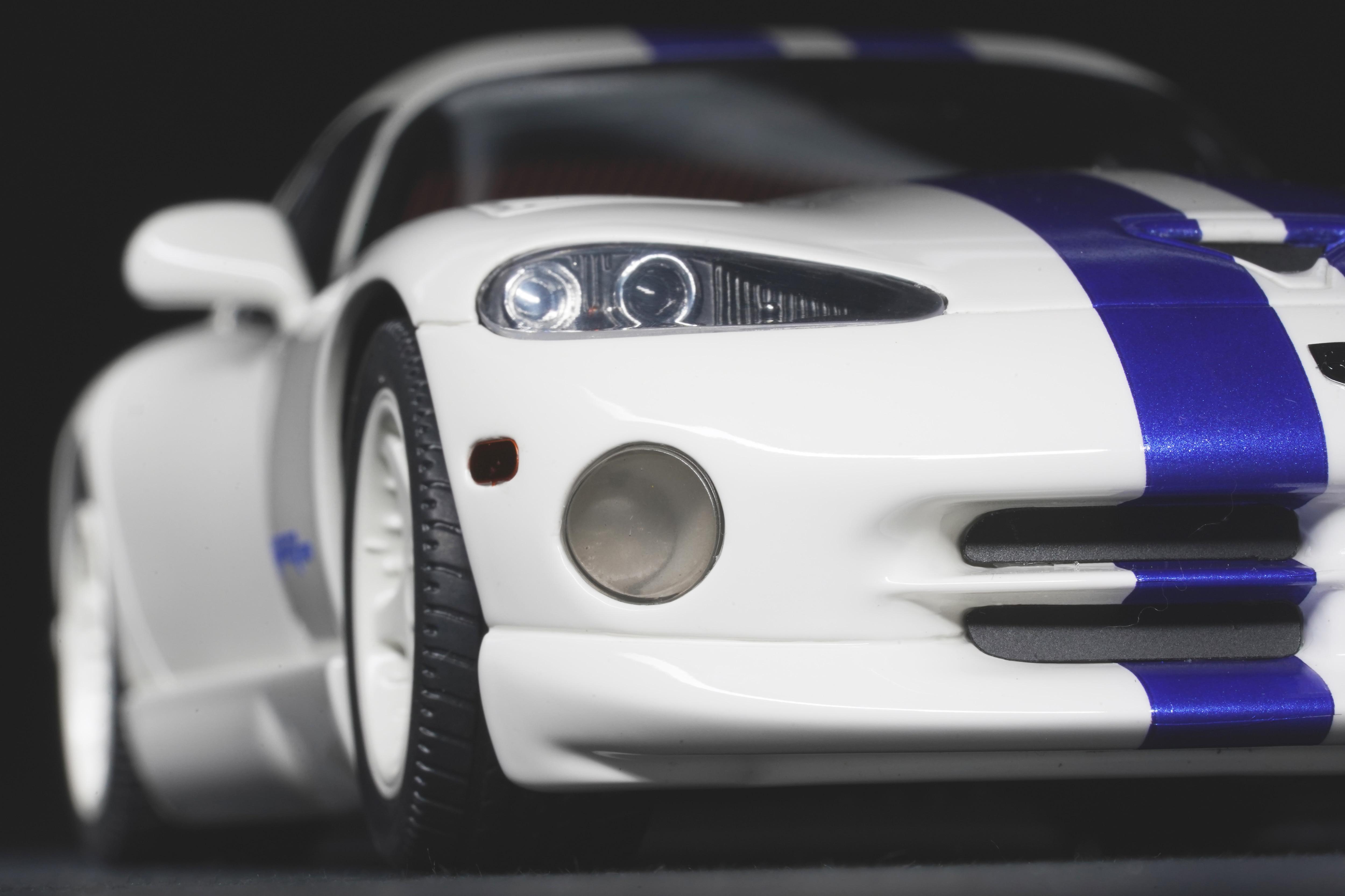 Il colpo d’occhio è dominato dal lungo cofano che custodisce il mostruoso V10 8 litri. Le prese d’aria e la particolare bombatura sono riprodotte con buona resa, mentre le righe blu, nette e precise, scorrono senza interruzioni dal muso alla coda, come sulla vettura reale, conferendole quel sapore “racing” che fece subito scuola nei vari abbinamenti cromatici. La verniciatura è lucida, senza imperfezioni e valorizza i molti dettagli apprezzabili della GTS: il paraurti anteriore con le grandi prese d’aria e tutta la fanaleria frontale carenata. Particolari i cerchi a cinque razze in tinta con la carrozzeria, con pneumatici in gomma di taglia XL con scolpitura vicina a quella originale, e assetto regolato alla giusta altezza. Le fiancate del modello mettono bene in risalto il profilo muscoloso, e le giuste geometrie scendono in picchiata verso la coda tronca. La vista posteriore chiude l’analisi esterna con la dominante fanaleria rossa orizzontale e la particolare forma dello spoiler, che la distingue dalle prime RT/10. Curato il doppio terminale posizionato centralmente, e tutti i loghi presenti sono graficamente precisi e di alta qualità.