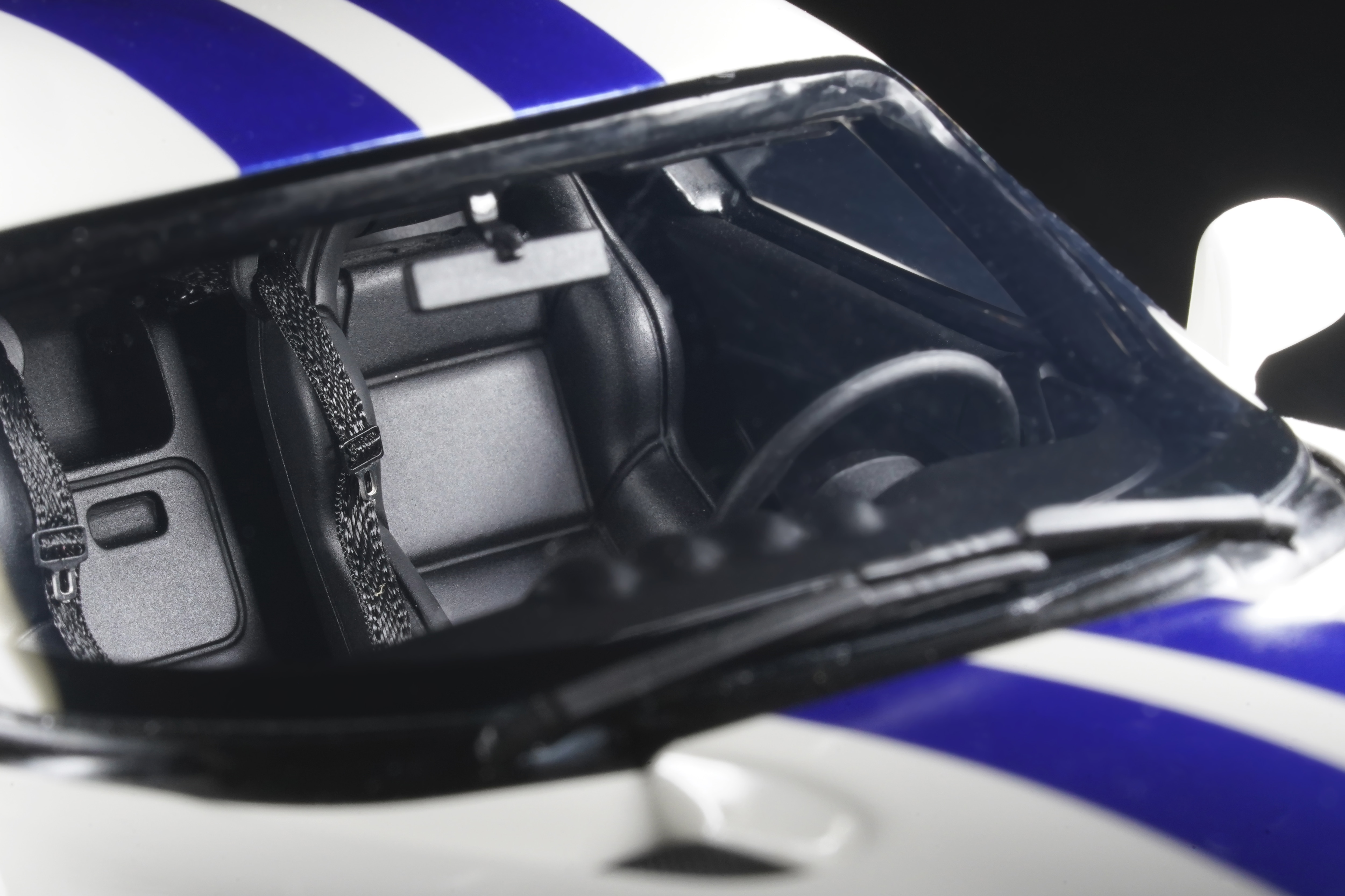 Gli interni, visibili attraverso i finestrini e l’ampio lunotto, ripropongono la classica impostazione da muscle car moderna, coerente con l’essenzialità dell’abitacolo reale: sedili sportivi in tono scuro, plancia orientata verso il guidatore, strumentazione distribuita tra cruscotto e plancia, consolle centrale con i restanti comandi e leva del cambio corta, quasi a ricordare il rapporto diretto tra pilota e meccanica. Una vera Gran Turismo estrema, che sulle piste statunitensi e internazionali fece incetta di successi. Qualitativamente curata e a suo agio in piccole o grandi collezioni, è un modello che parla di potenza bruta e di fascino racing anni 90. Una pietra miliare del modellismo stradale USA in arrivo nei migliori negozi a 109,95 €, in linea con il listino e la qualità GT Spirit.