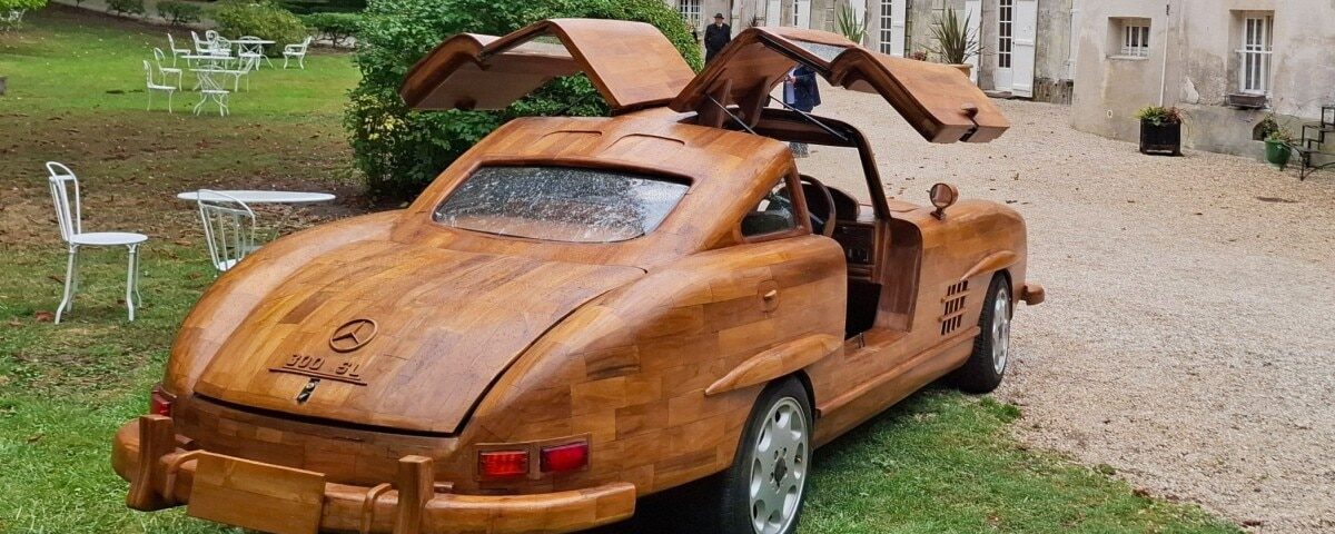 Ha invece un prezzo ben preciso – perché è stata battuta all’asta qualche mese fa al Palais des Congrès di Tours in Francia – questa Mercedes 300 SL, fatta interamente di legno. Deve essere piaciuta veramente molto, perché i 32 mila euro ai quali è stata aggiudicata sono esattamente il doppio della stima iniziale, fatta dagli esperti di Rouillac. Remi Le Forestier è il nome del creatore di questa curiosa variazione sul tema, in quanto la base è una vettura reale, un’altra Mercedes. In genere, infatti, ci si imbatte in riproduzioni statiche scolpite nel legno – anche a grandezza reale – come, per esempio, la Citroën 2CV realizzata nel 2017 dall’artista Michel Robillard e venduta a 170 mila euro, sempre da Rouillac.