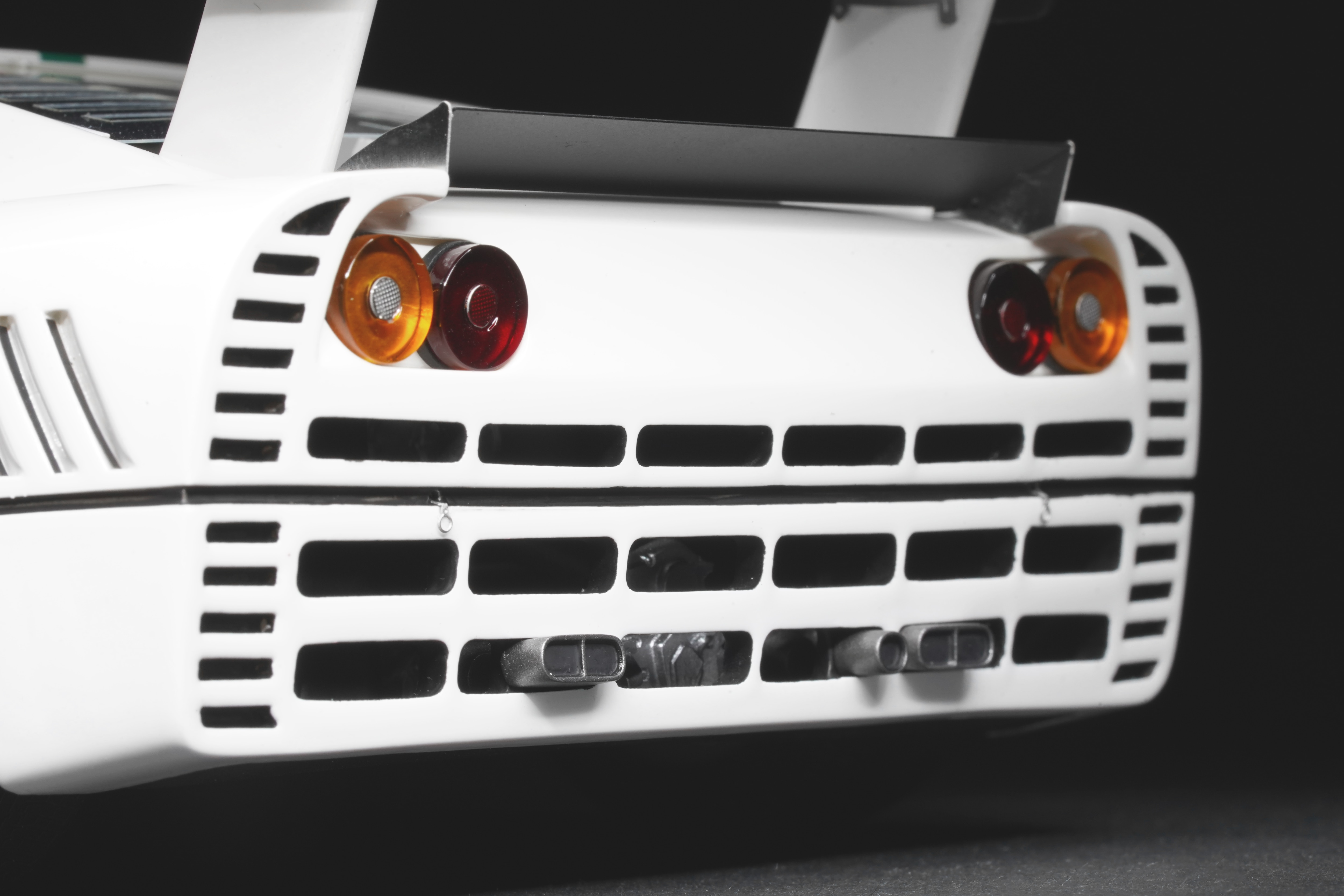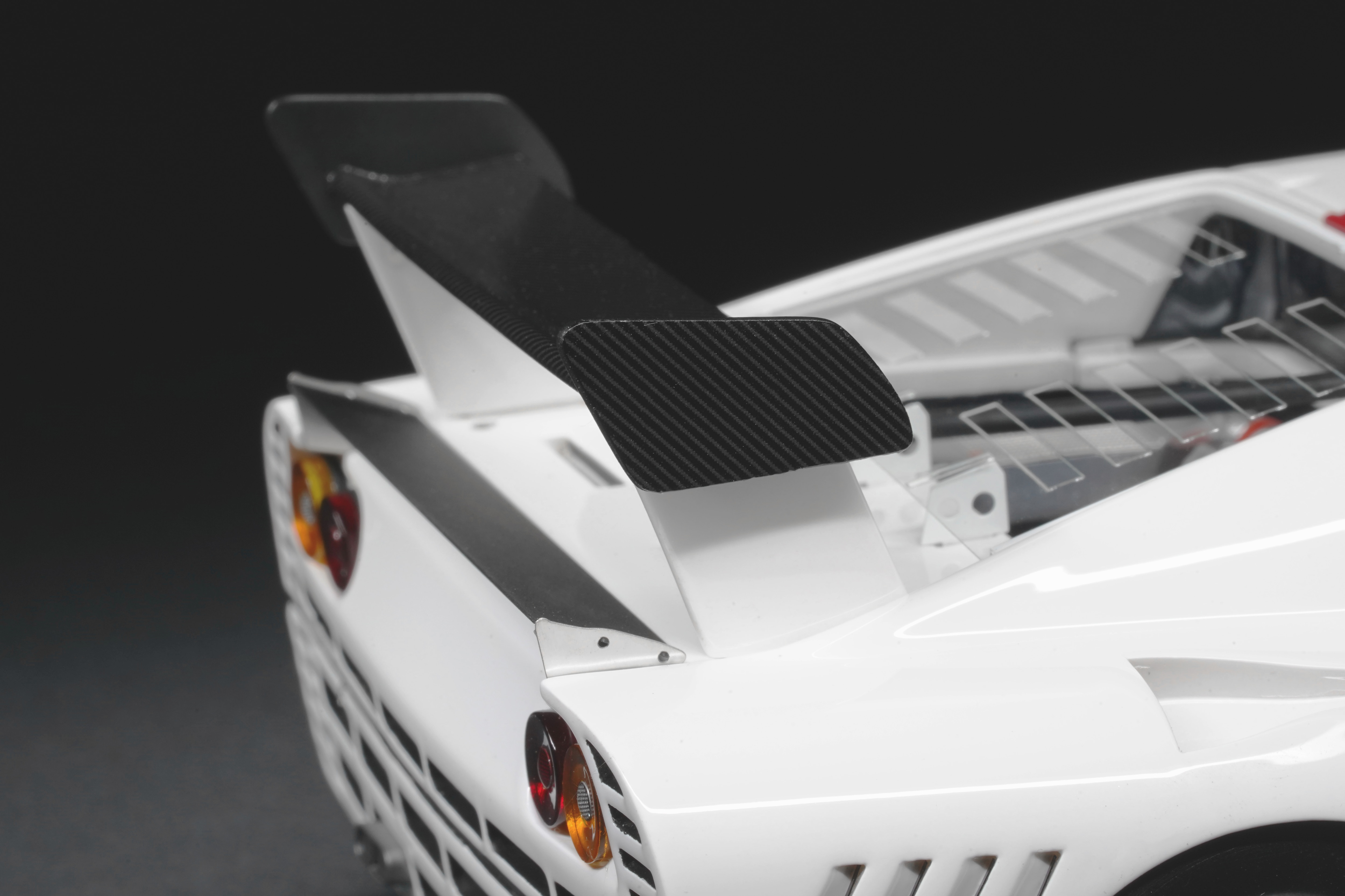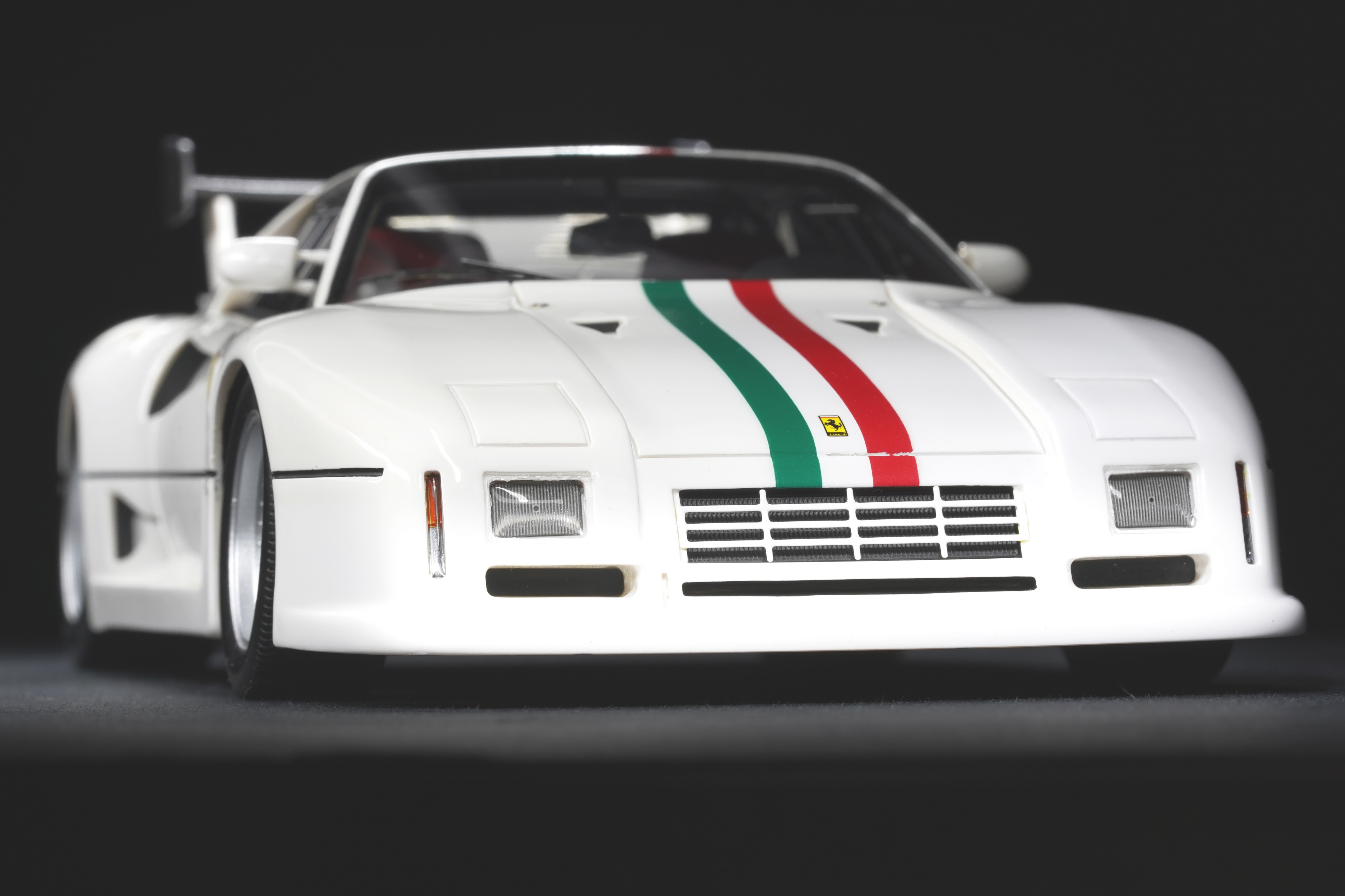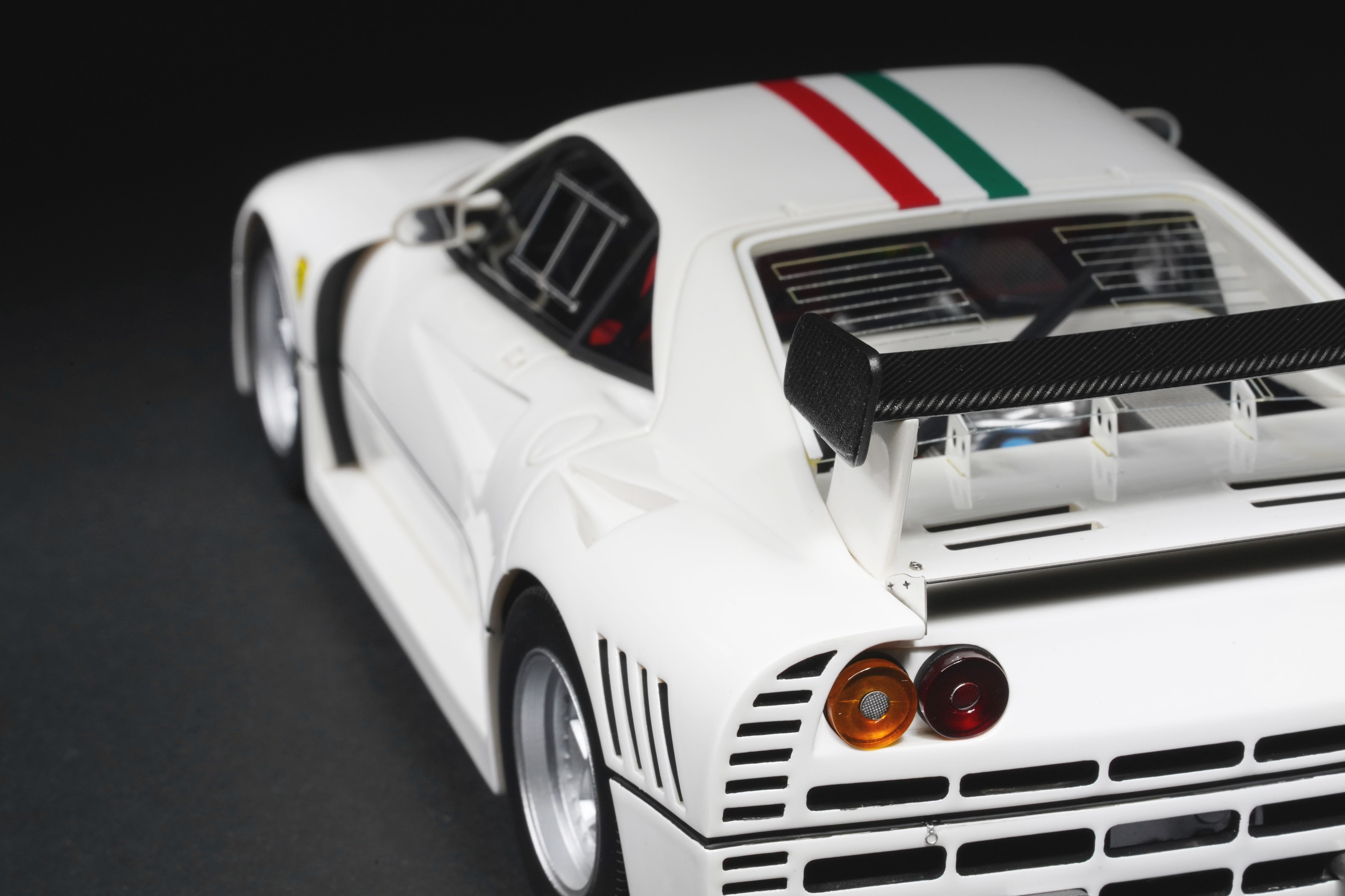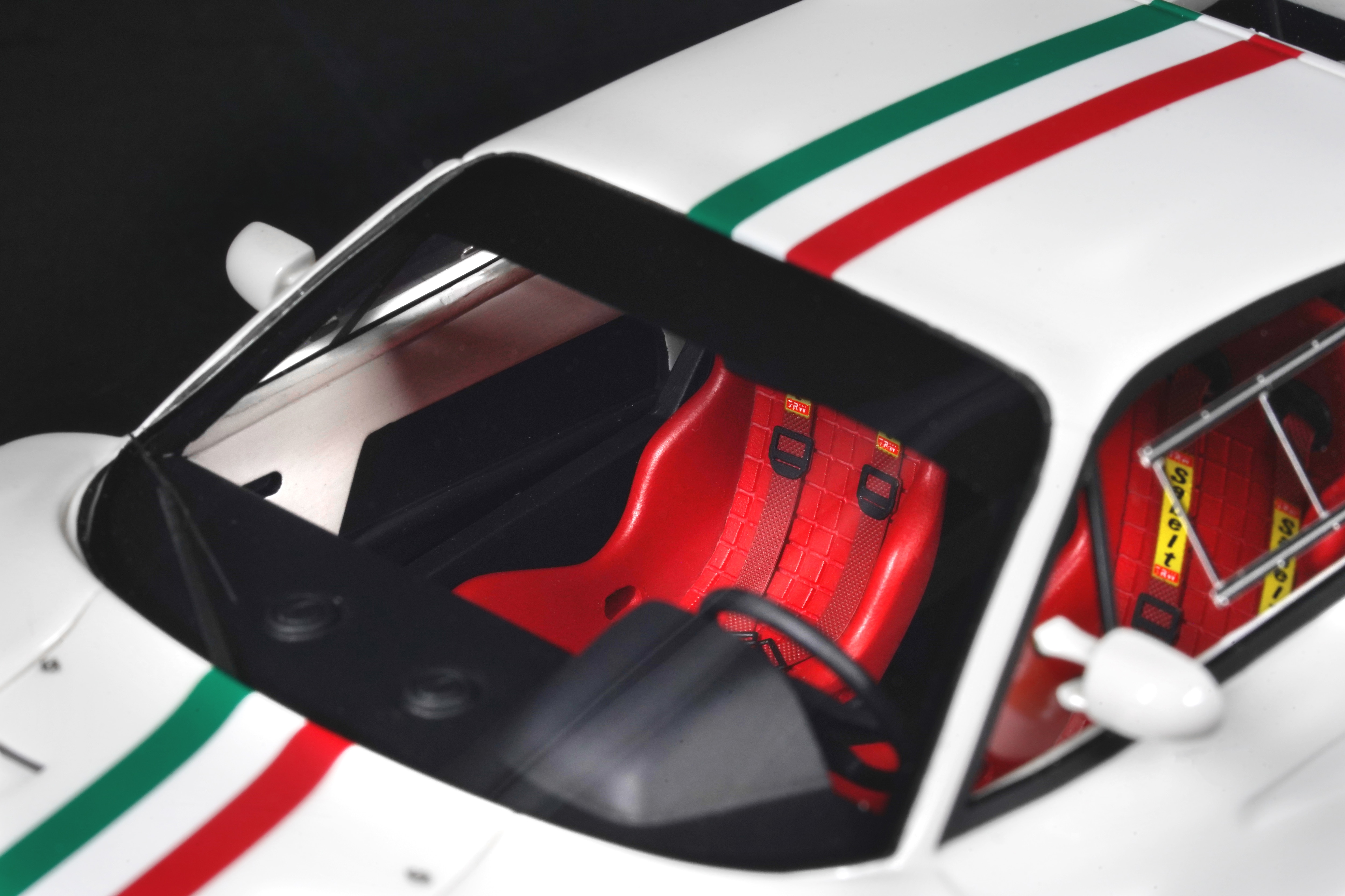 Il frontale basso e largo, con prese d’aria maggiorate e fari carenati, trasmette un senso di aggressività pura anche in scala. Le fiancate, profondamente scolpite, mostrano sfoghi d’aria e condotti funzionali, mentre l’ampia carreggiata, unita a un assetto ultra-ribassato, rende l’idea dell’audacia di un progetto che guardava già – senza dirlo – verso la F40. La coda dall’alettone è sorretta da supporti verticali ben riprodotti, con una resa materica convincente. Qualitativamente curate le tante feritoie del paraurti posteriore, con incisioni nette e senza sbavature, che ospitano scarichi riprodotti con un tono di colore metallico credibile. I gruppi ottici circolari sono fedelmente riprodotti, così come la struttura del motore visibile dietro il lunotto.