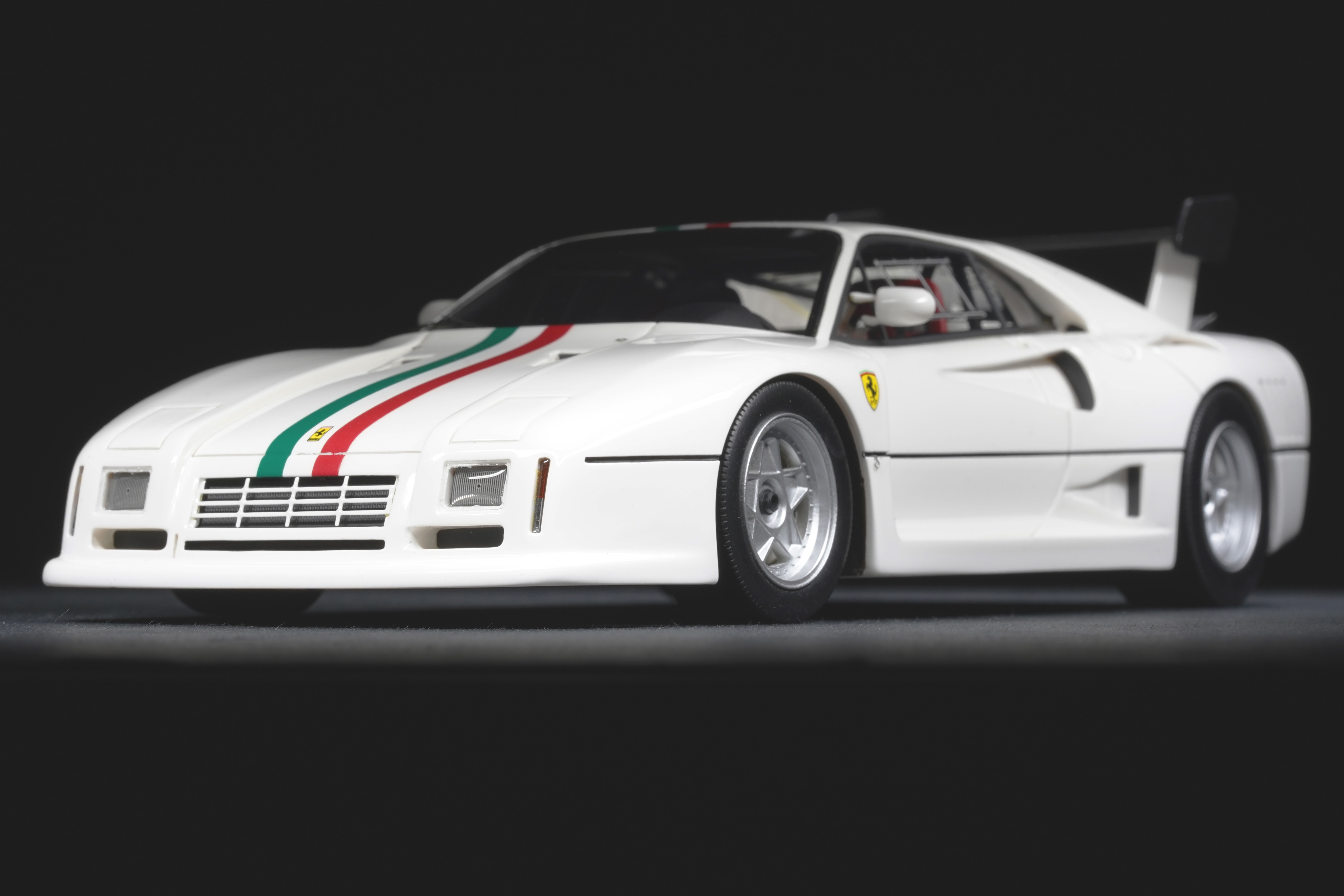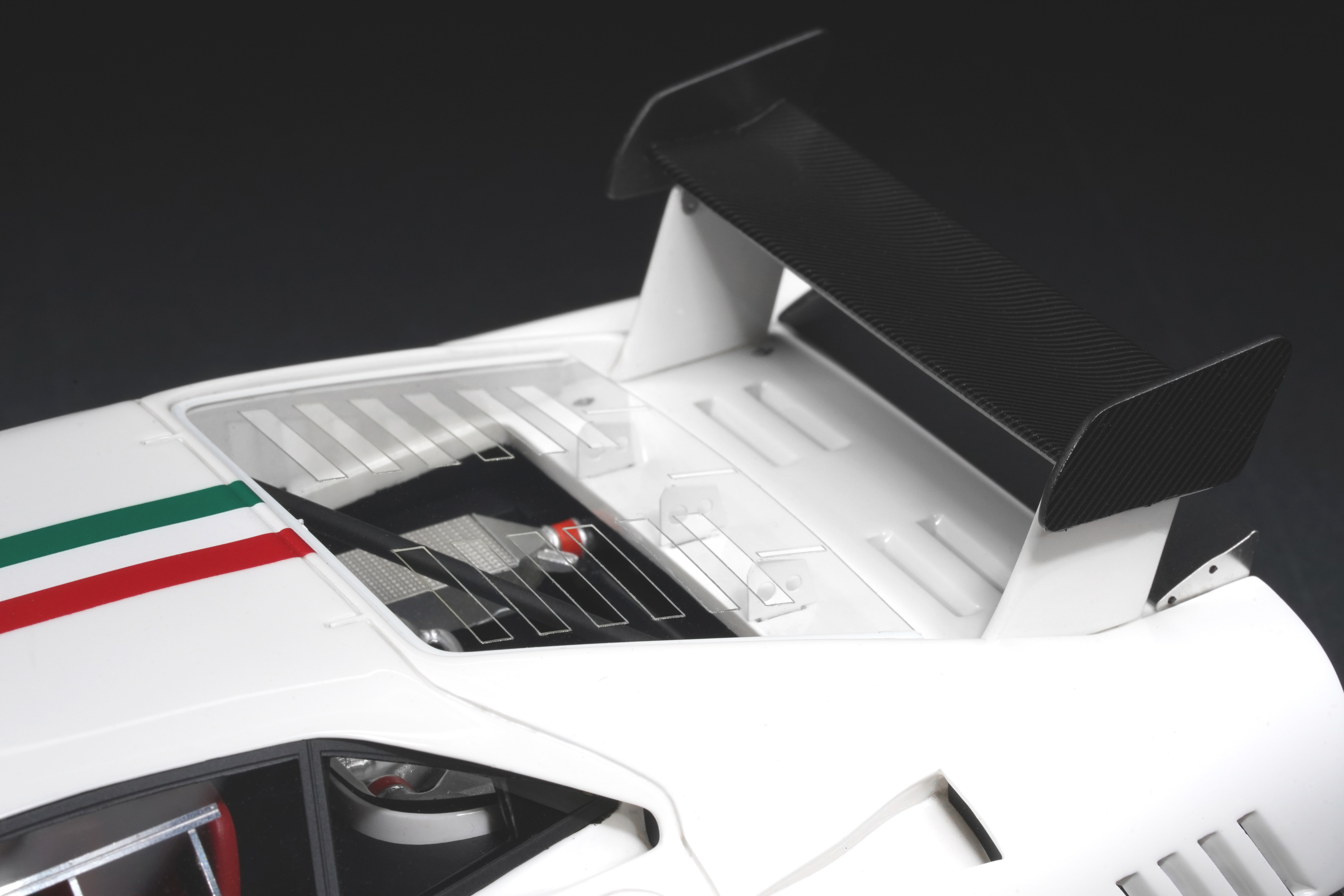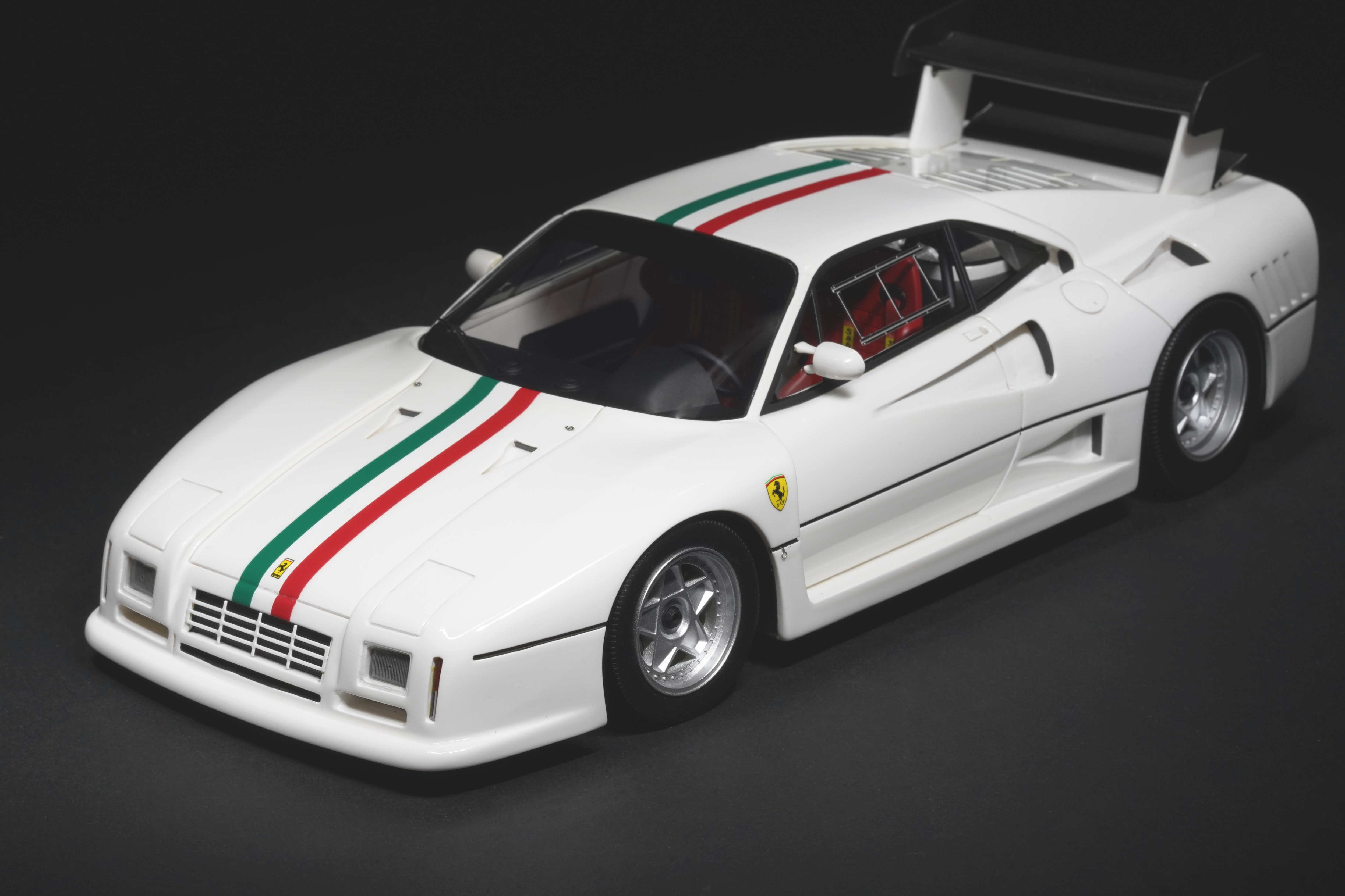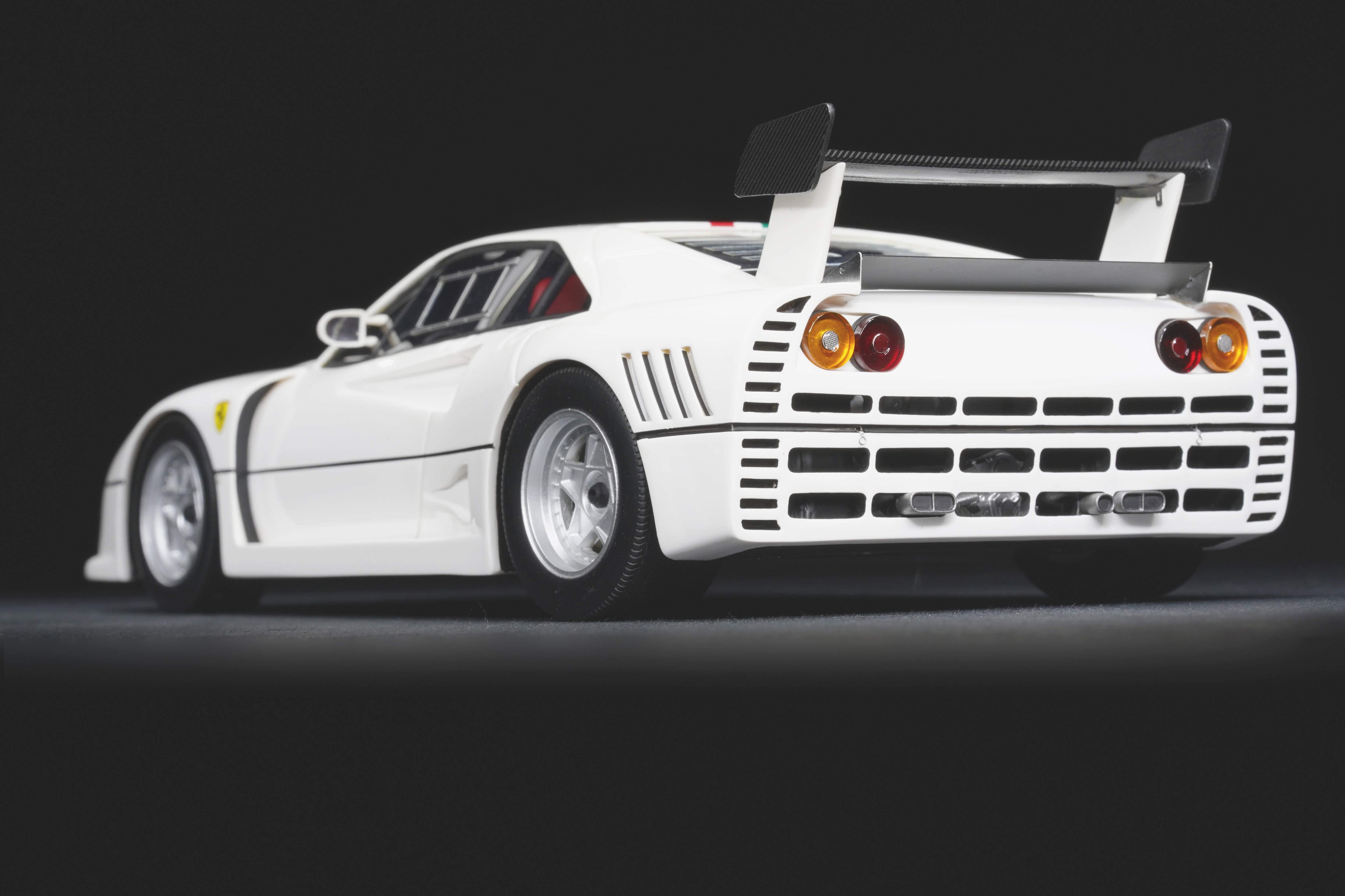Il frontale basso e largo, con prese d’aria maggiorate e fari carenati, trasmette un senso di aggressività pura anche in scala. Le fiancate, profondamente scolpite, mostrano sfoghi d’aria e condotti funzionali, mentre l’ampia carreggiata, unita a un assetto ultra-ribassato, rende l’idea dell’audacia di un progetto che guardava già – senza dirlo – verso la F40. La coda dall’alettone è sorretta da supporti verticali ben riprodotti, con una resa materica convincente. Qualitativamente curate le tante feritoie del paraurti posteriore, con incisioni nette e senza sbavature, che ospitano scarichi riprodotti con un tono di colore metallico credibile. I gruppi ottici circolari sono fedelmente riprodotti, così come la struttura del motore visibile dietro il lunotto.