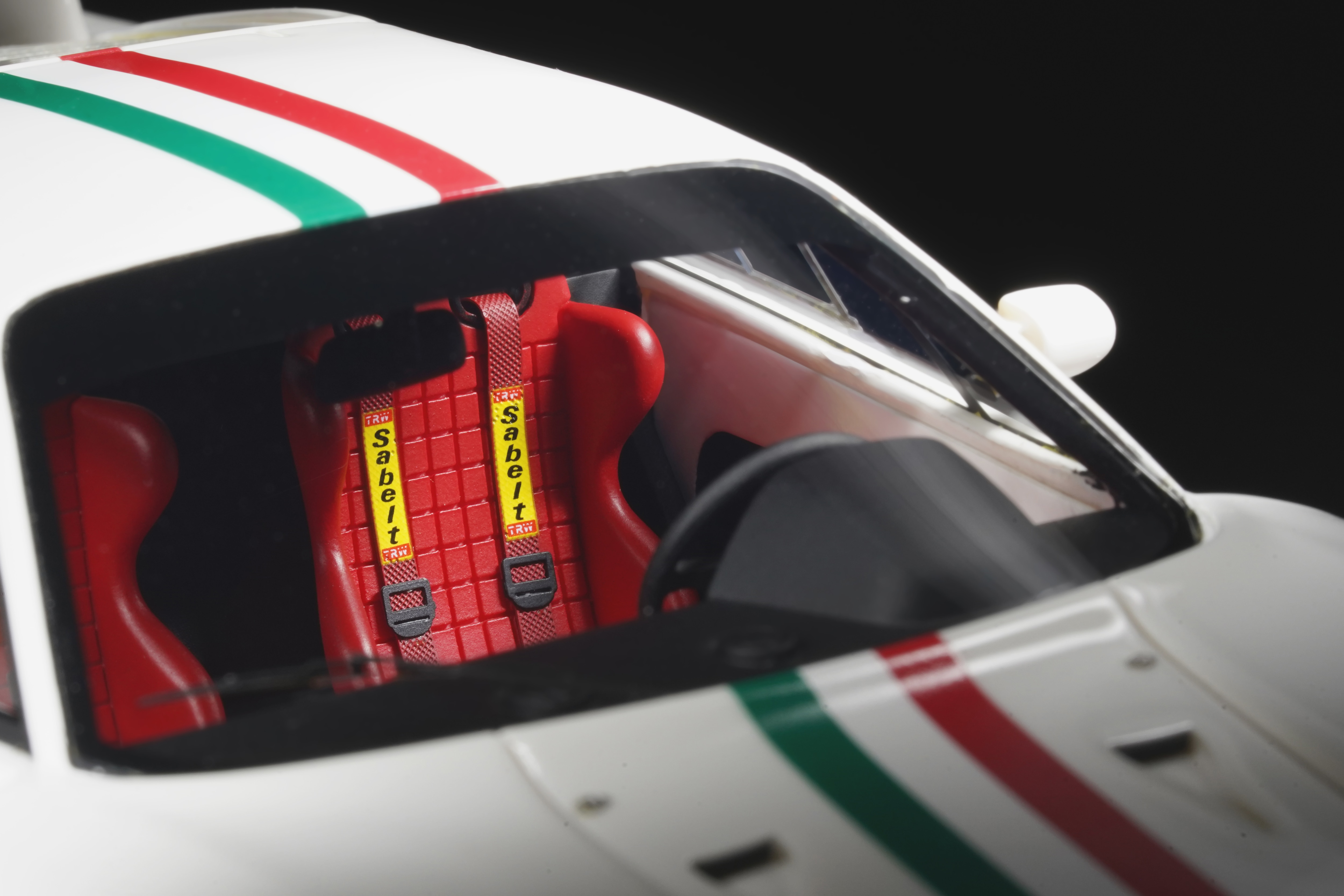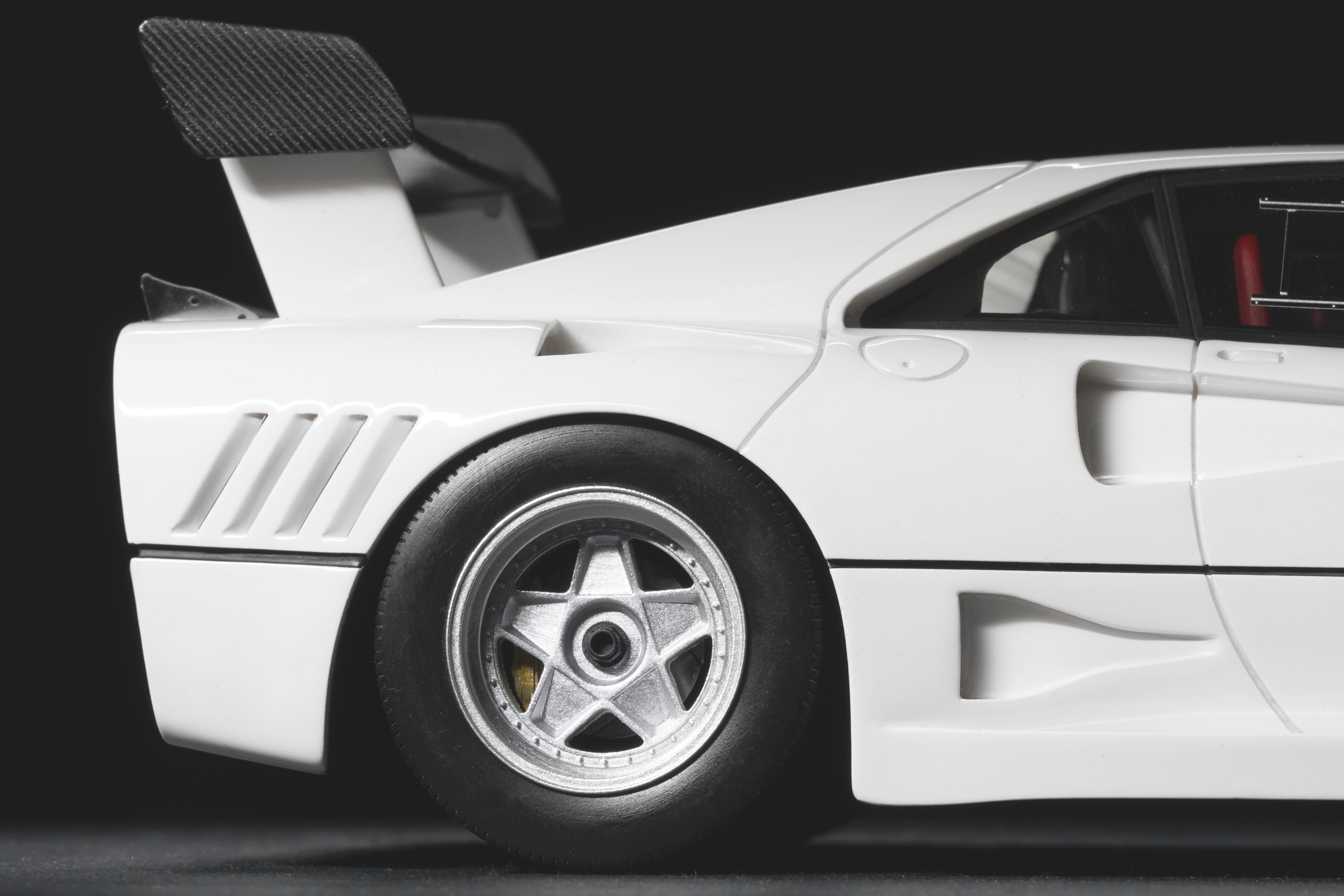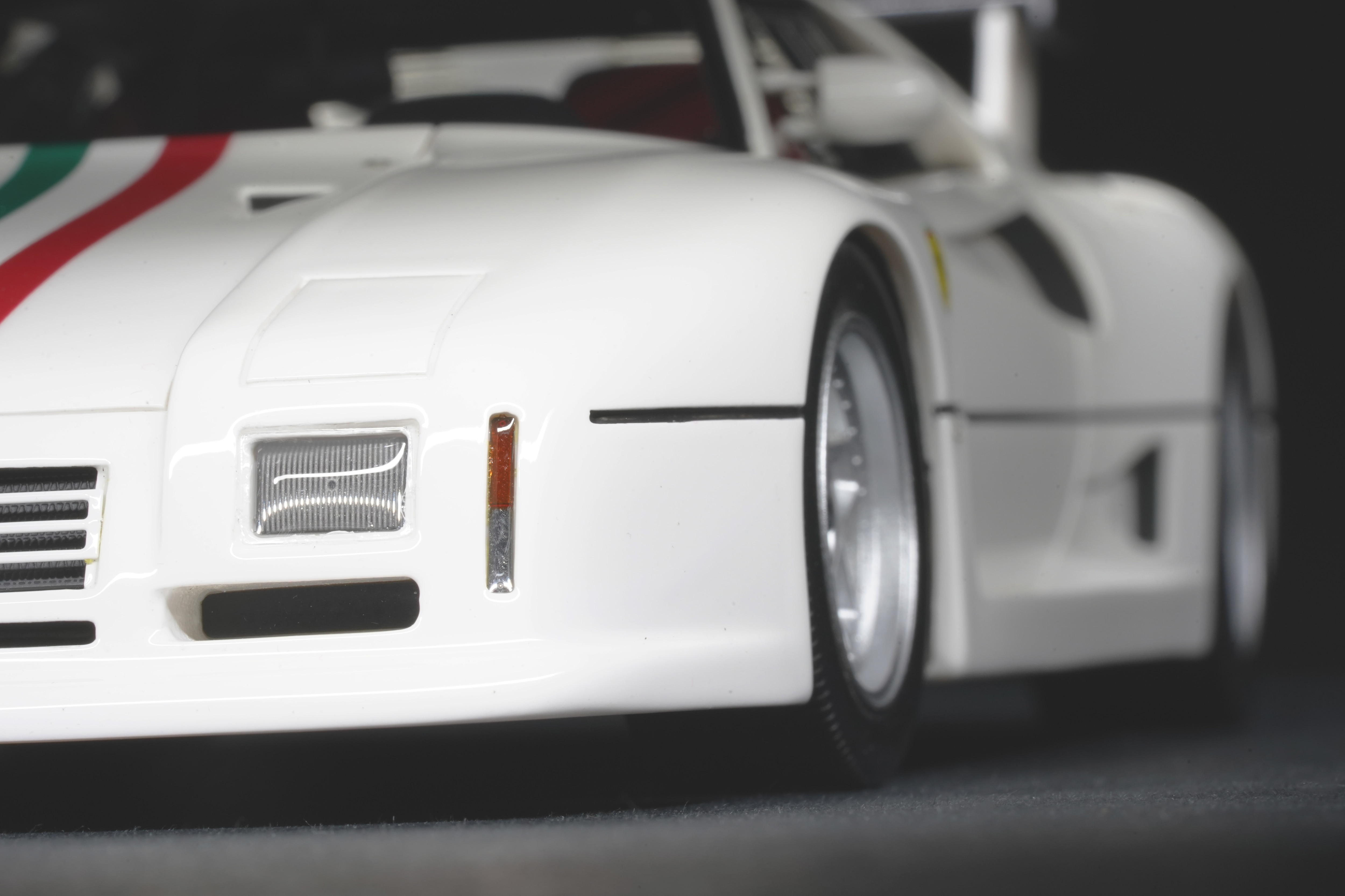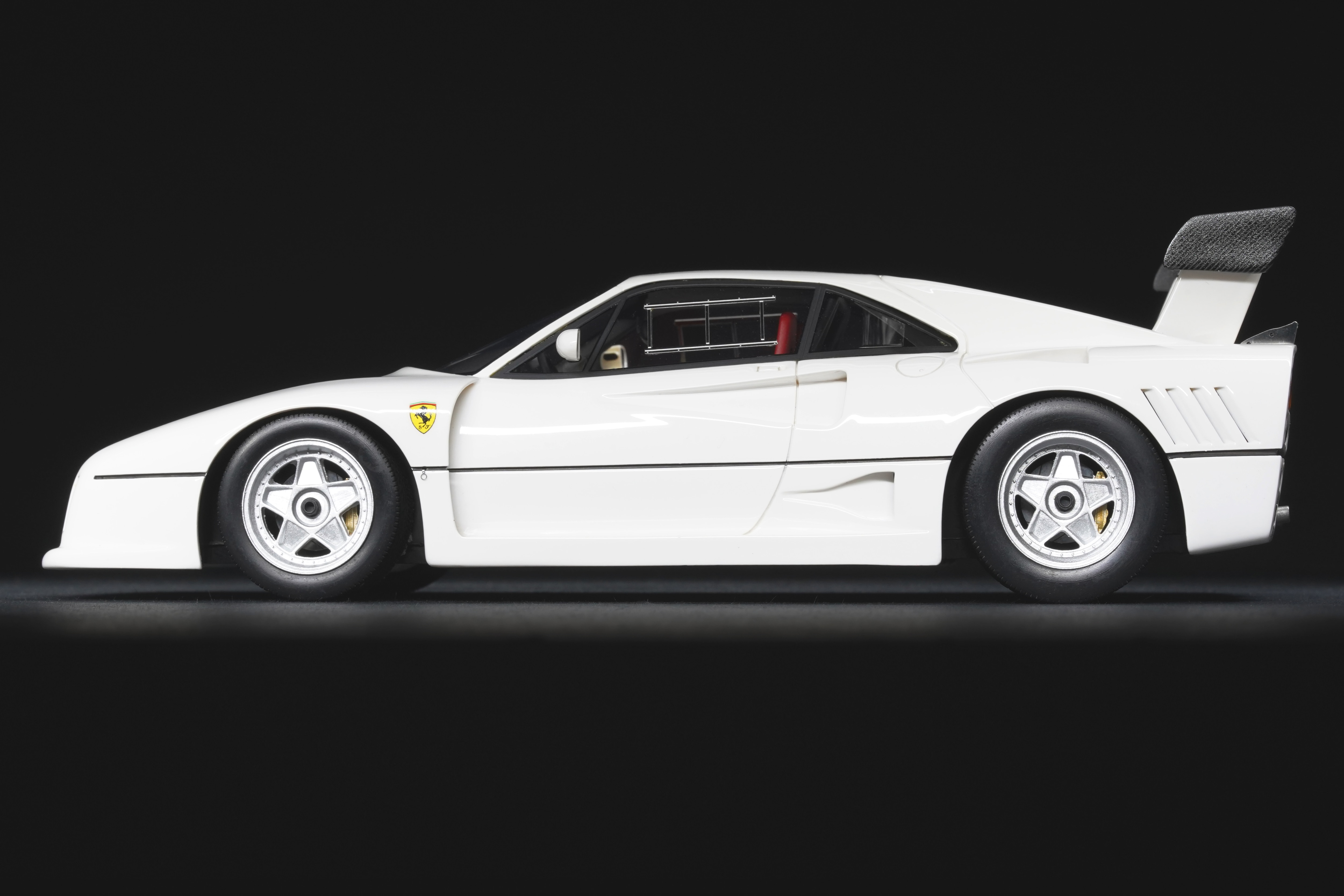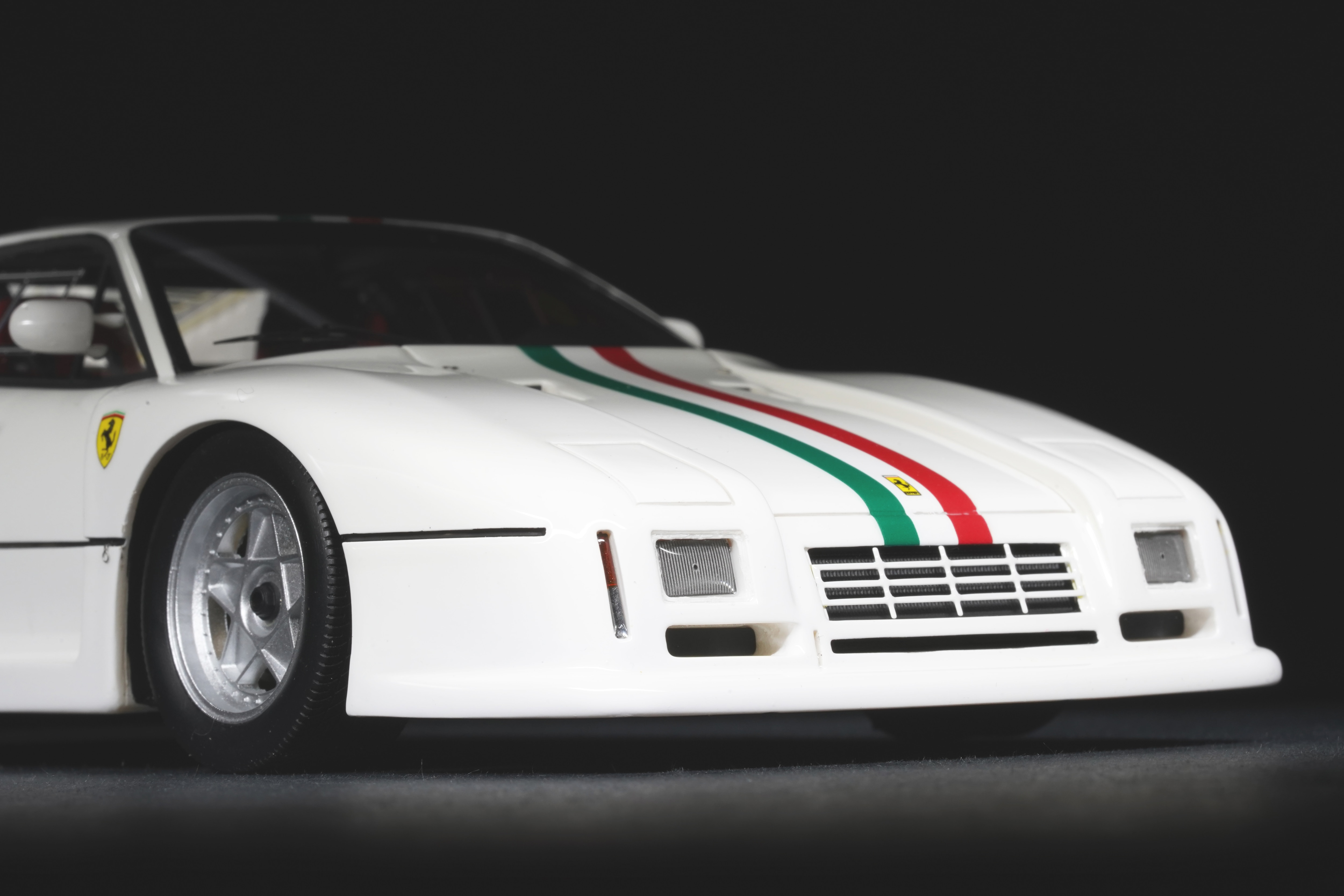 Il frontale basso e largo, con prese d’aria maggiorate e fari carenati, trasmette un senso di aggressività pura anche in scala. Le fiancate, profondamente scolpite, mostrano sfoghi d’aria e condotti funzionali, mentre l’ampia carreggiata, unita a un assetto ultra-ribassato, rende l’idea dell’audacia di un progetto che guardava già – senza dirlo – verso la F40. La coda dall’alettone è sorretta da supporti verticali ben riprodotti, con una resa materica convincente. Qualitativamente curate le tante feritoie del paraurti posteriore, con incisioni nette e senza sbavature, che ospitano scarichi riprodotti con un tono di colore metallico credibile. I gruppi ottici circolari sono fedelmente riprodotti, così come la struttura del motore visibile dietro il lunotto.