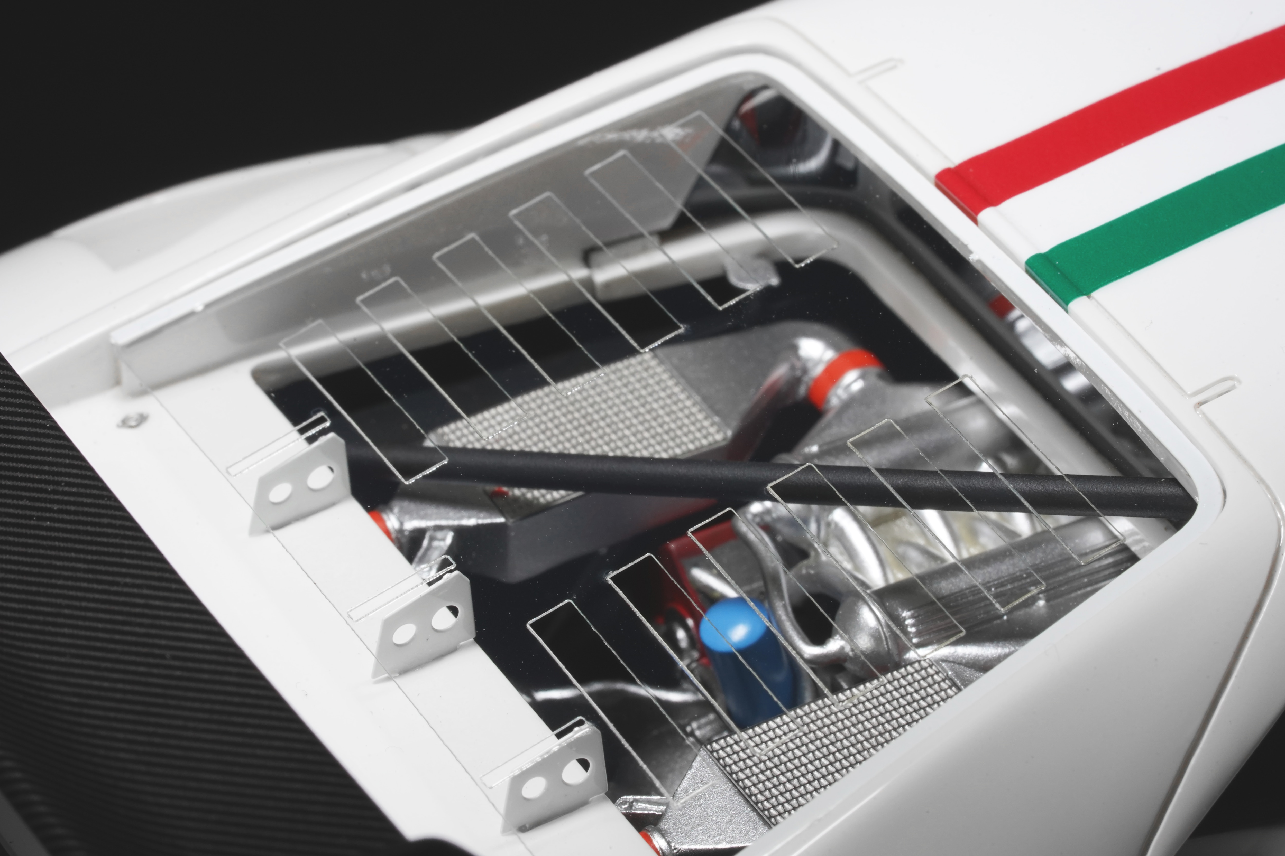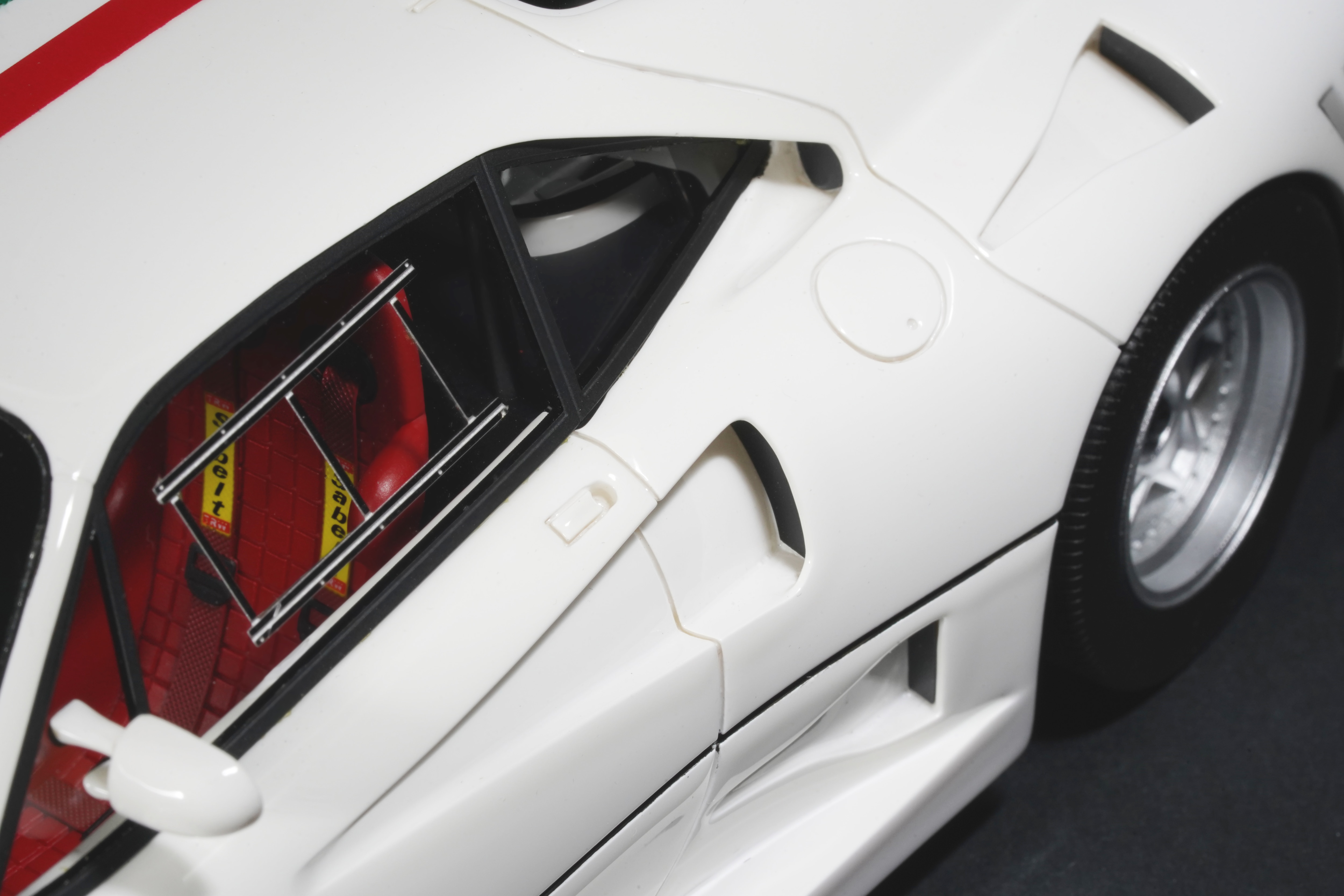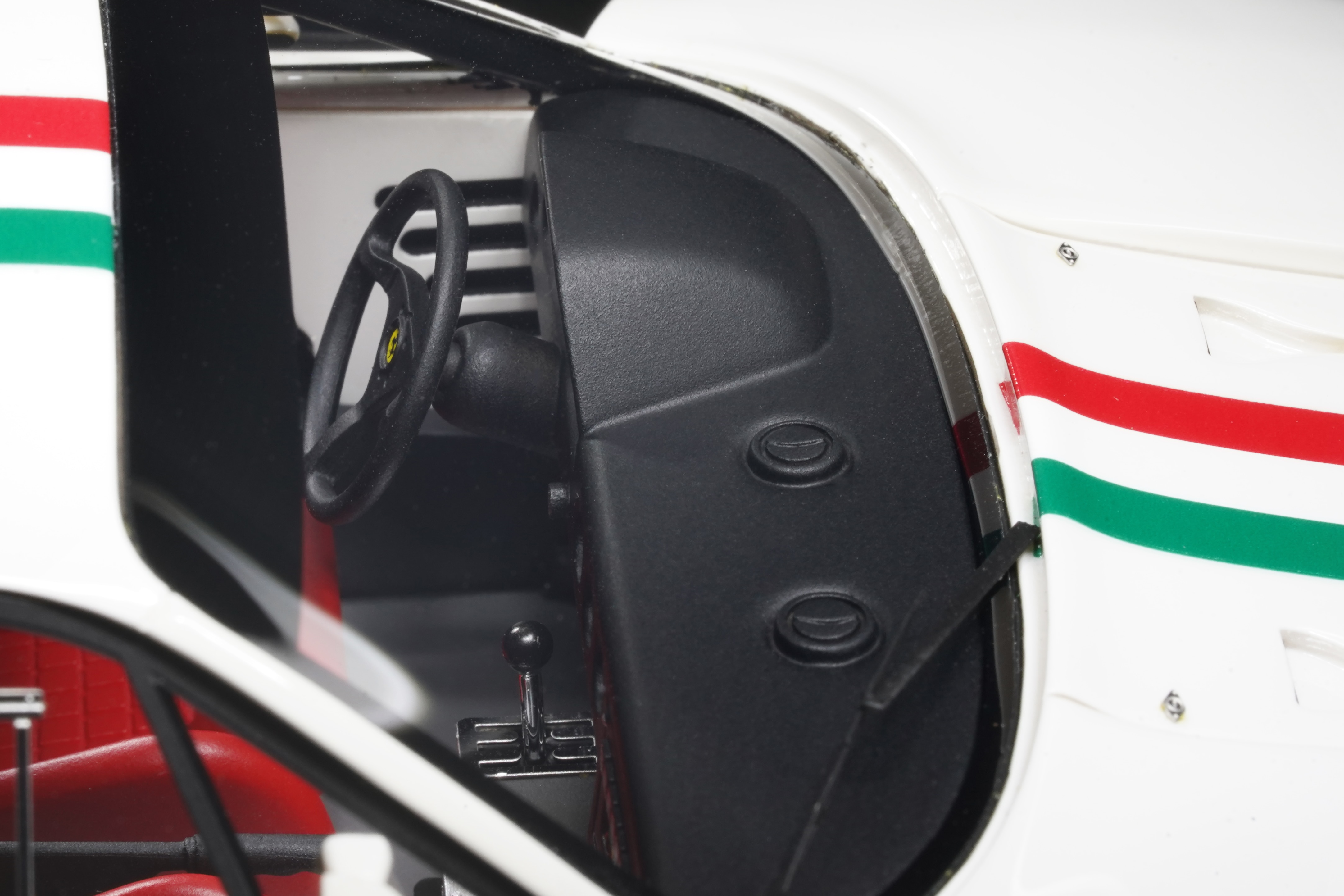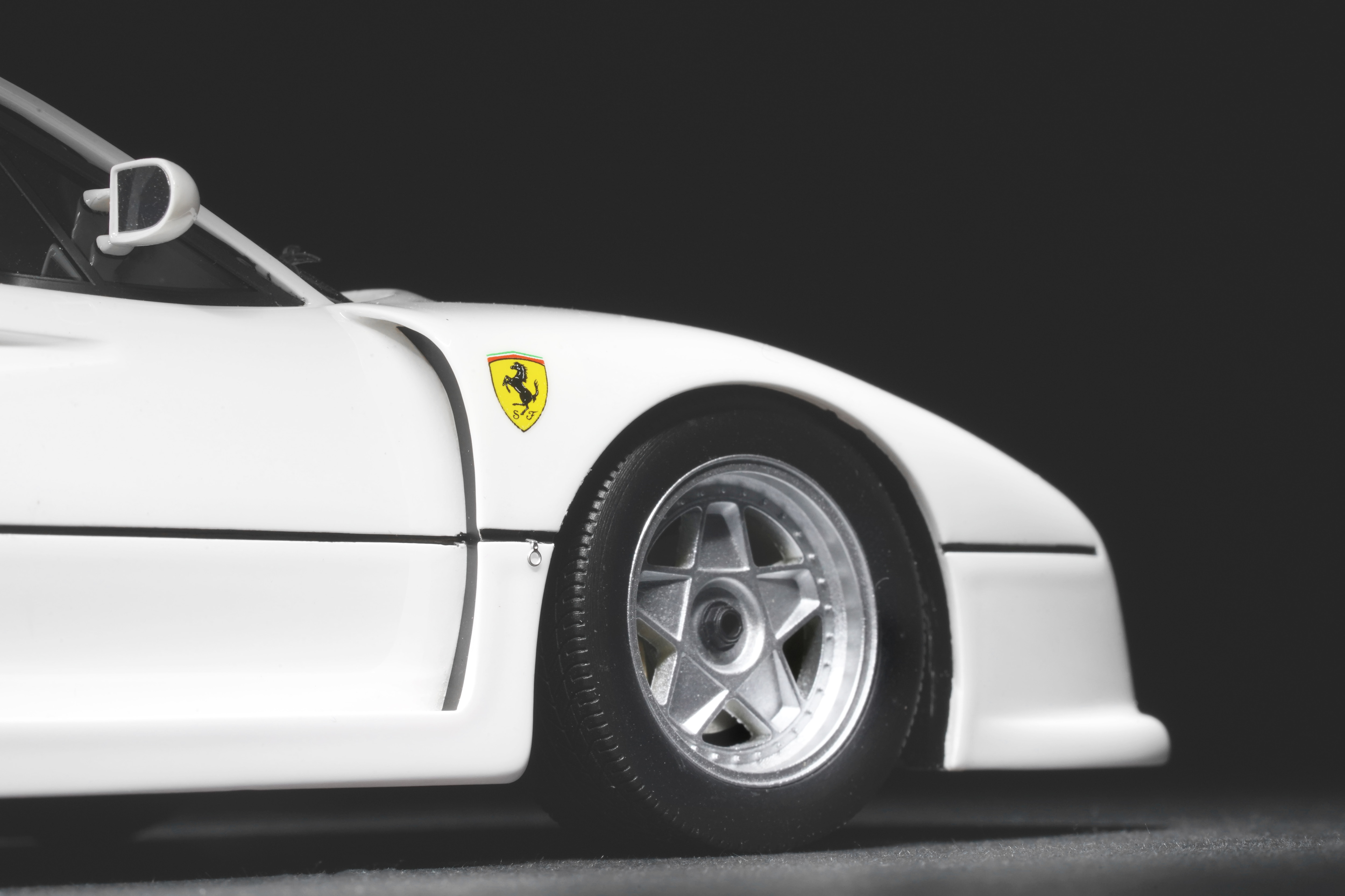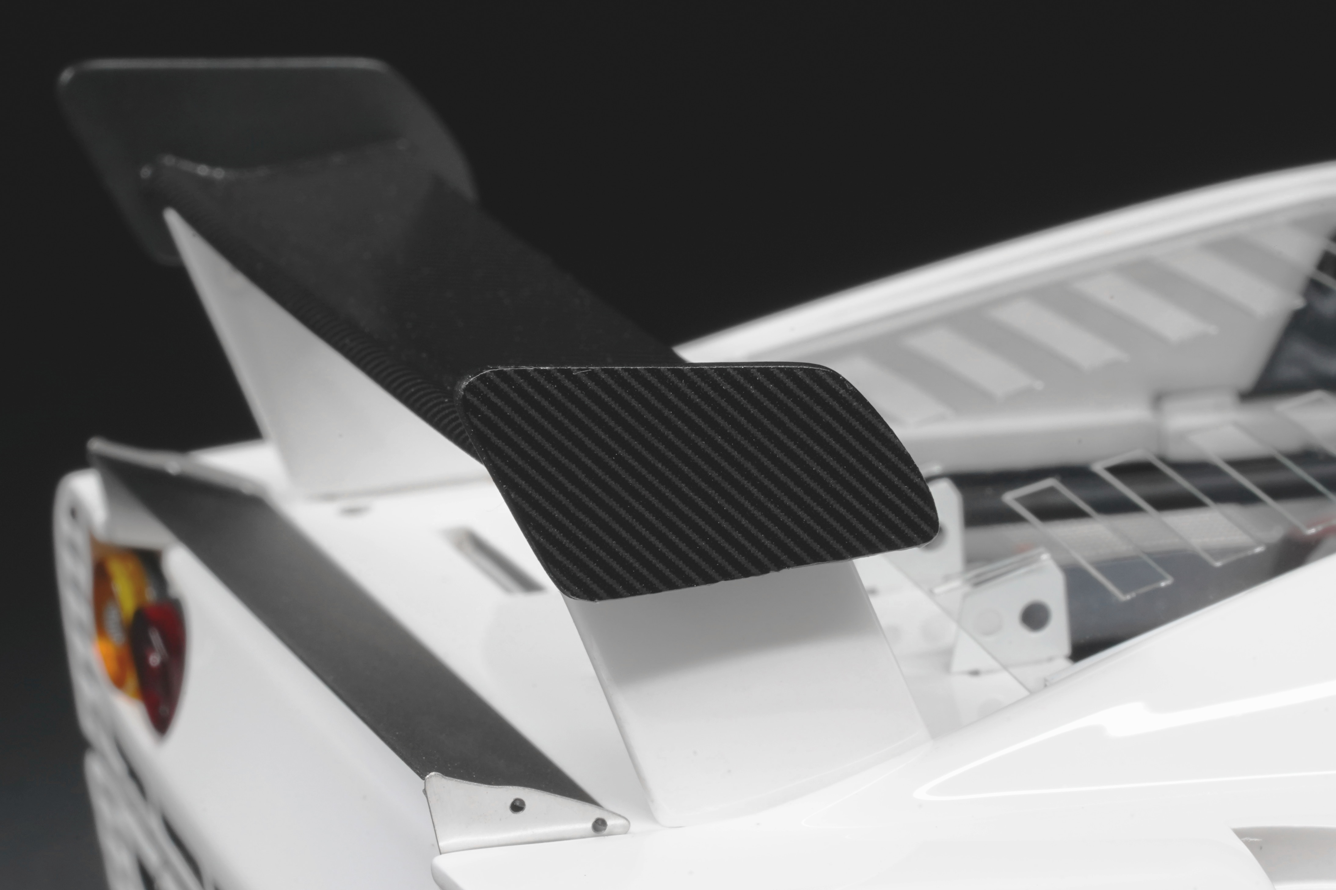 Il frontale basso e largo, con prese d’aria maggiorate e fari carenati, trasmette un senso di aggressività pura anche in scala. Le fiancate, profondamente scolpite, mostrano sfoghi d’aria e condotti funzionali, mentre l’ampia carreggiata, unita a un assetto ultra-ribassato, rende l’idea dell’audacia di un progetto che guardava già – senza dirlo – verso la F40. La coda dall’alettone è sorretta da supporti verticali ben riprodotti, con una resa materica convincente. Qualitativamente curate le tante feritoie del paraurti posteriore, con incisioni nette e senza sbavature, che ospitano scarichi riprodotti con un tono di colore metallico credibile. I gruppi ottici circolari sono fedelmente riprodotti, così come la struttura del motore visibile dietro il lunotto.