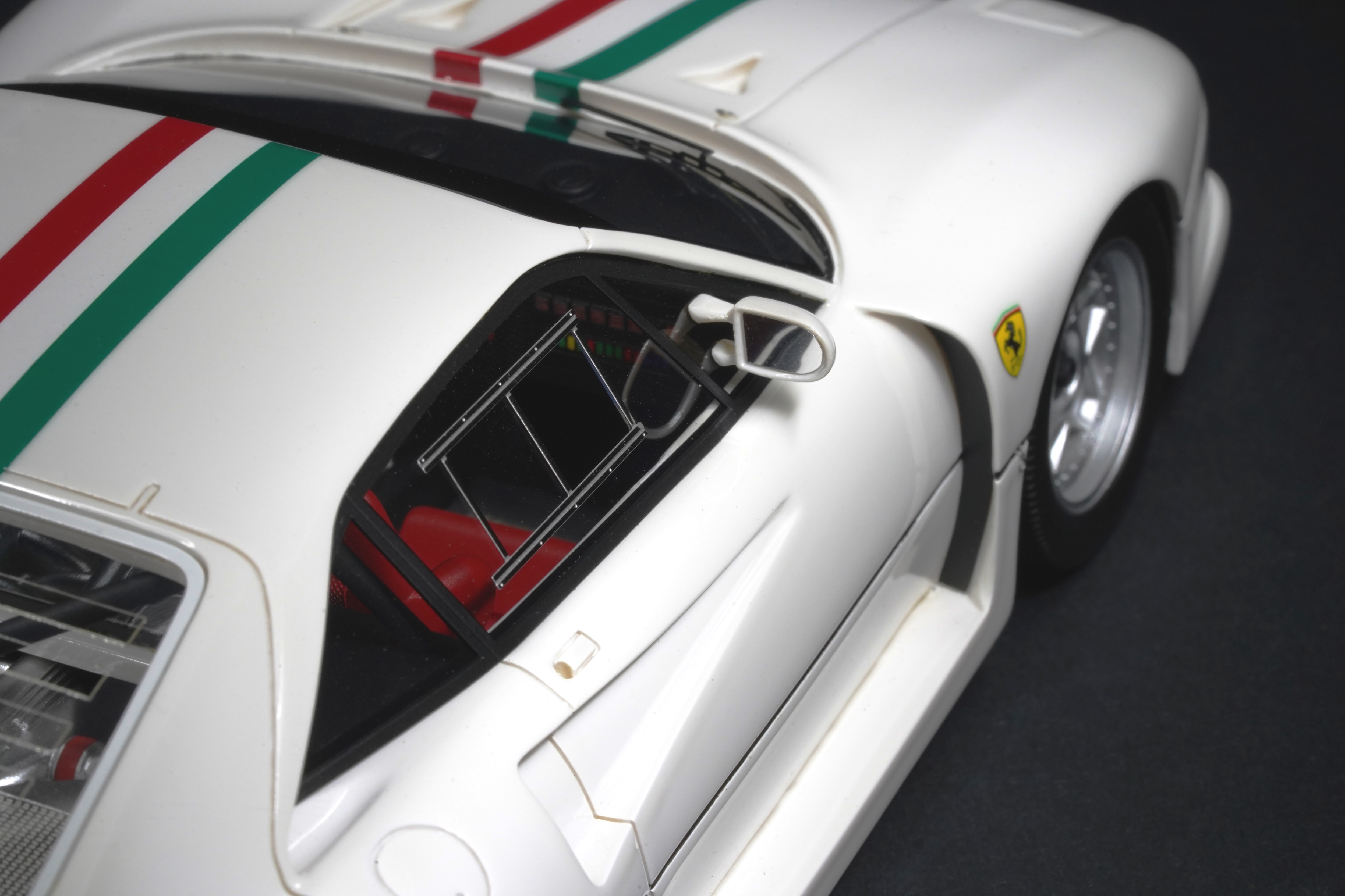 La scala 1:18 enfatizza le soluzioni tecniche e aerodinamiche; qui, con la Ferrari 288 GTO Evoluzione, queste vengono rese ancora più estreme, grazie anche alla livrea “sperimentale” in total white, interrotta unicamente dal tricolore che la attraversa centralmente.