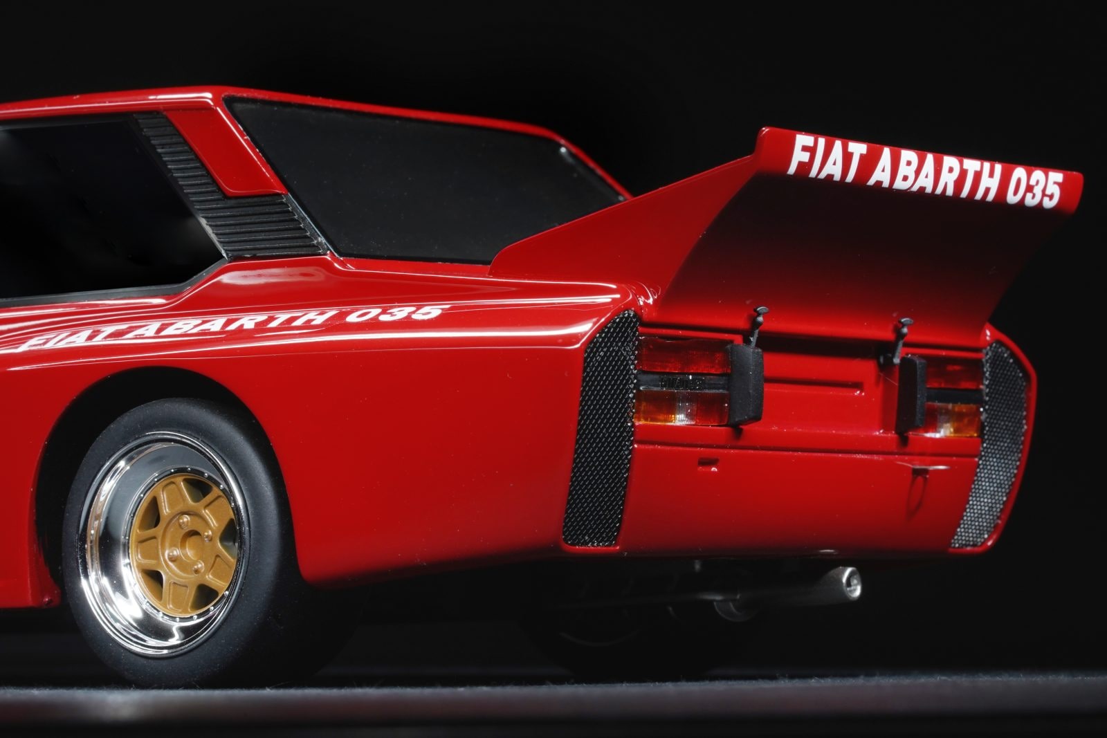 Esteticamente, oltre al rosso lucido, l’occhio cade sulla muscolatura del modello: passaruota allargati, carreggiate generose, spoiler anteriore pronunciato e un alettone posteriore XXL. Il frontale offre una precisa ricostruzione della calandra nera con al centro la scritta “Fiat Abarth” ben leggibile tra le coppie di fari realizzate, come sempre, con buona trasparenza. Il cofano evidenzia, attraverso dettagli come prese d’aria e ganci di chiusura, l’indole sportiva senza compromessi. Osservando il modello lateralmente è impossibile non soffermarsi sui particolari cerchi e pneumatici bicolore, il tutto ben misurato per replicare l’assetto piantato e aggressivo dell’esemplare reale.