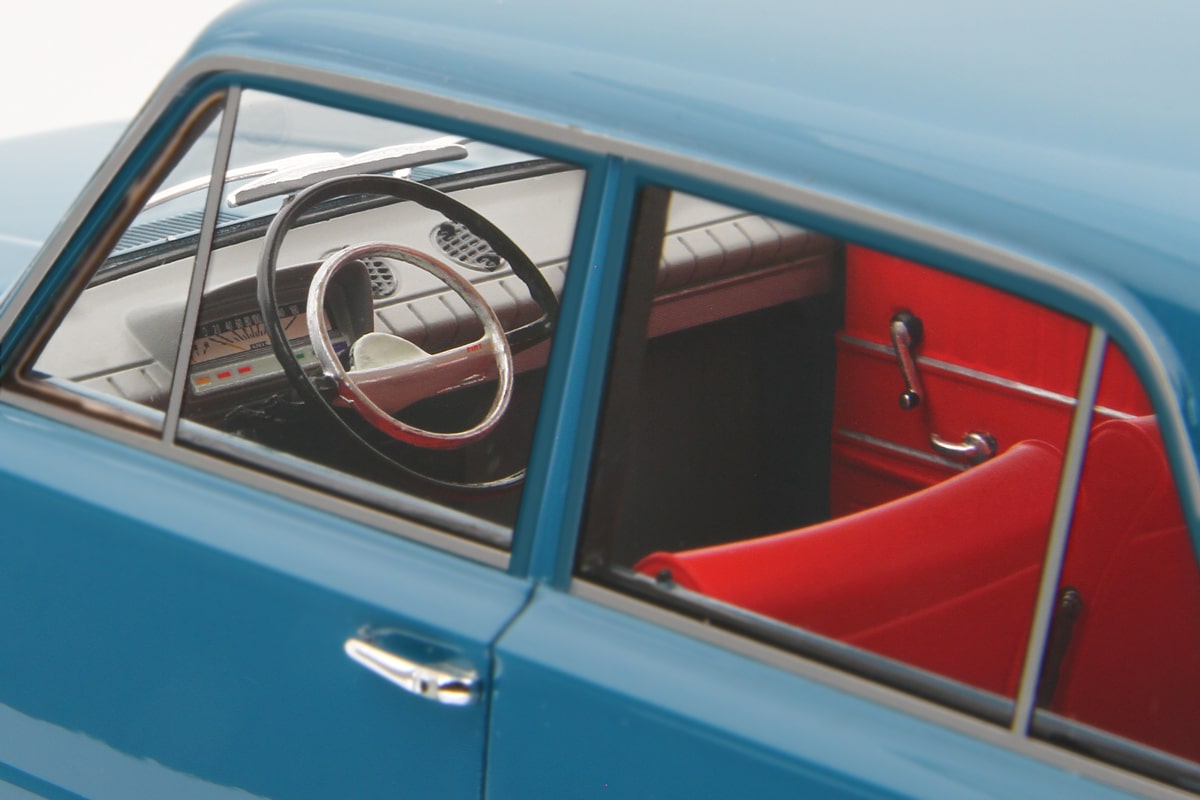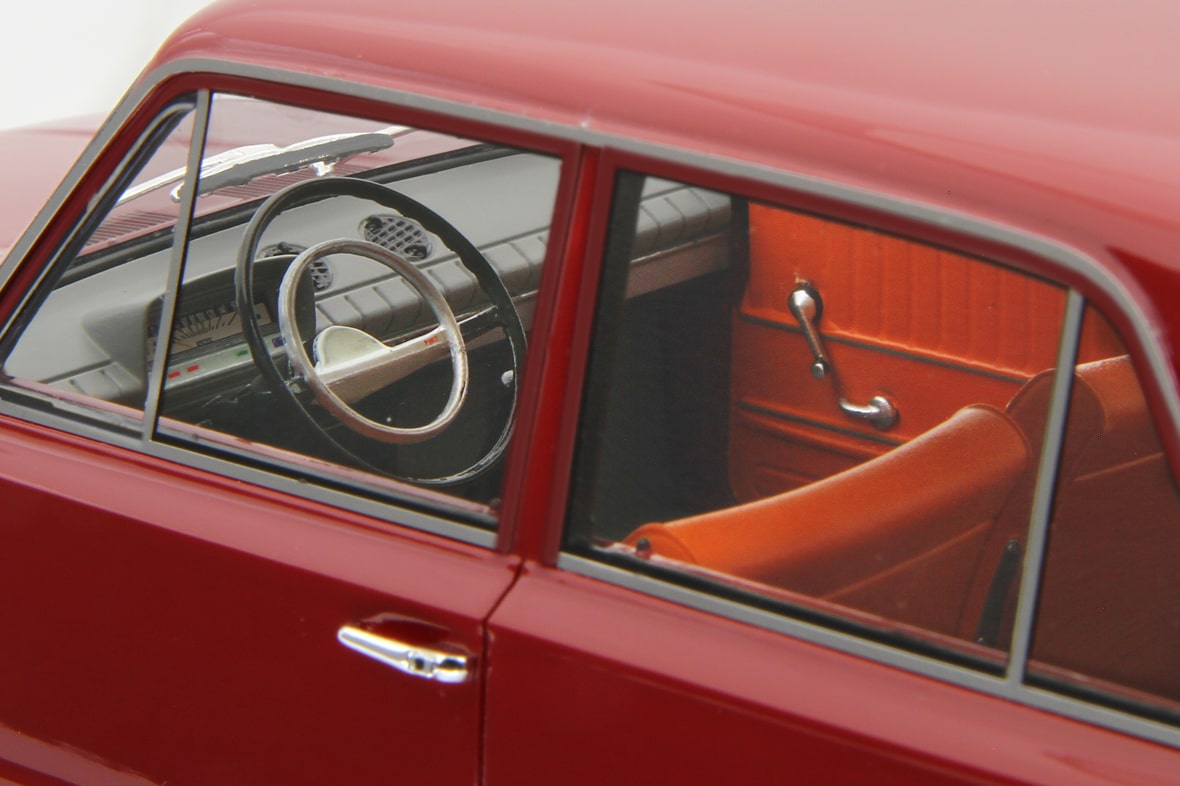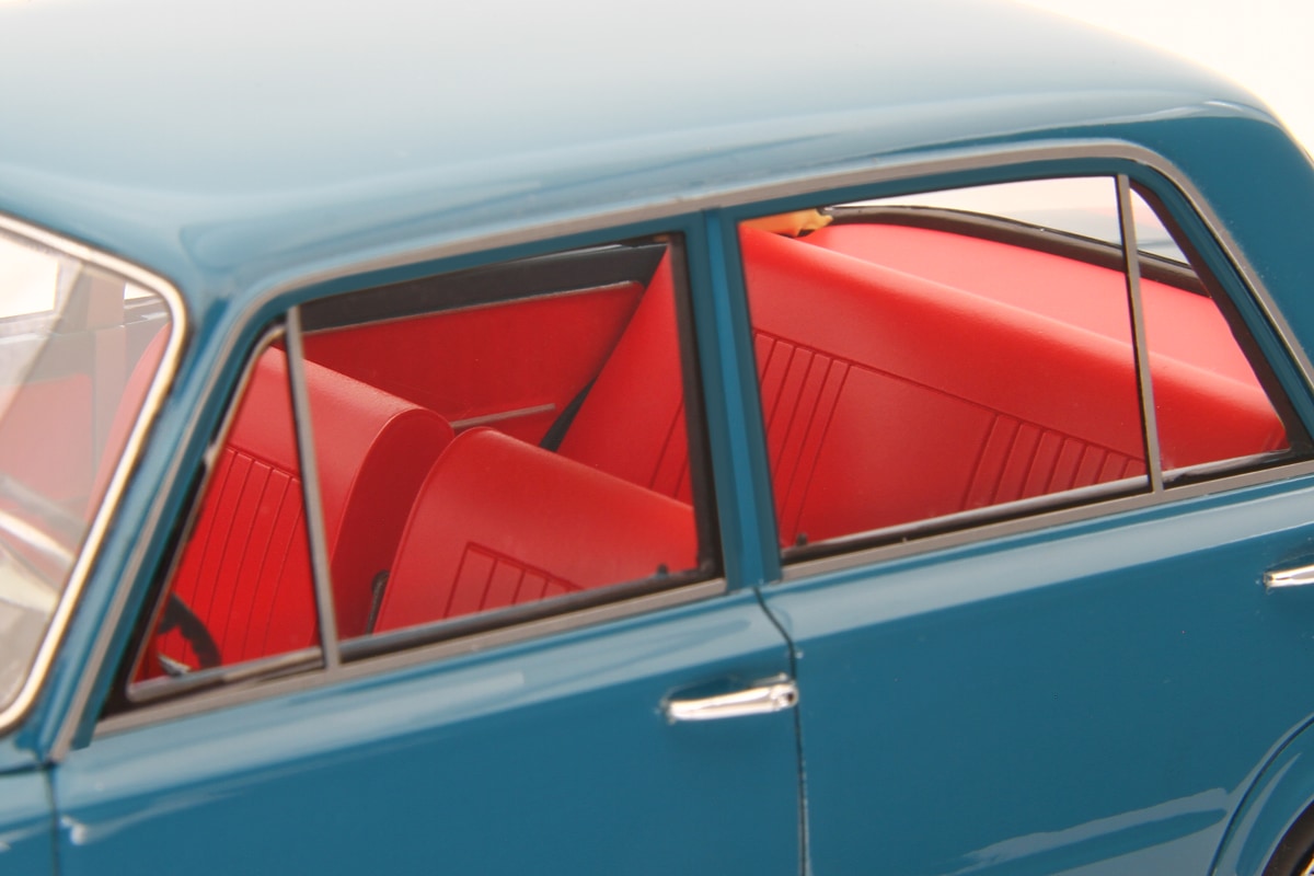 La carrozzeria replica al meglio la leggerezza visiva dell’originale, con equilibrio nelle proporzioni tra volumi e superfici. Si apprezza il passo lungo rispetto alla categoria dell’epoca e la sottile nervatura laterale che corre diritta come un tratto di matita tecnica sul modello. Il frontale, con la calandra rettangolare a sviluppo orizzontale e i sottili paraurti cromati, ospita i gruppi ottici circolari incastonati con precisione e realizzati con trasparenze di buon livello. La coda offre tutti i dettagli essenziali e, da qualunque angolo la si guardi, risulta proporzionata e corretta, con la targa “Torino” bianca e nera che dà un tocco in più. I cerchi stampati con coppe cromate e gli pneumatici di gomma riportano alla memoria le statali percorse con calma, i finestrini leggermente abbassati e la radio AM in sottofondo.